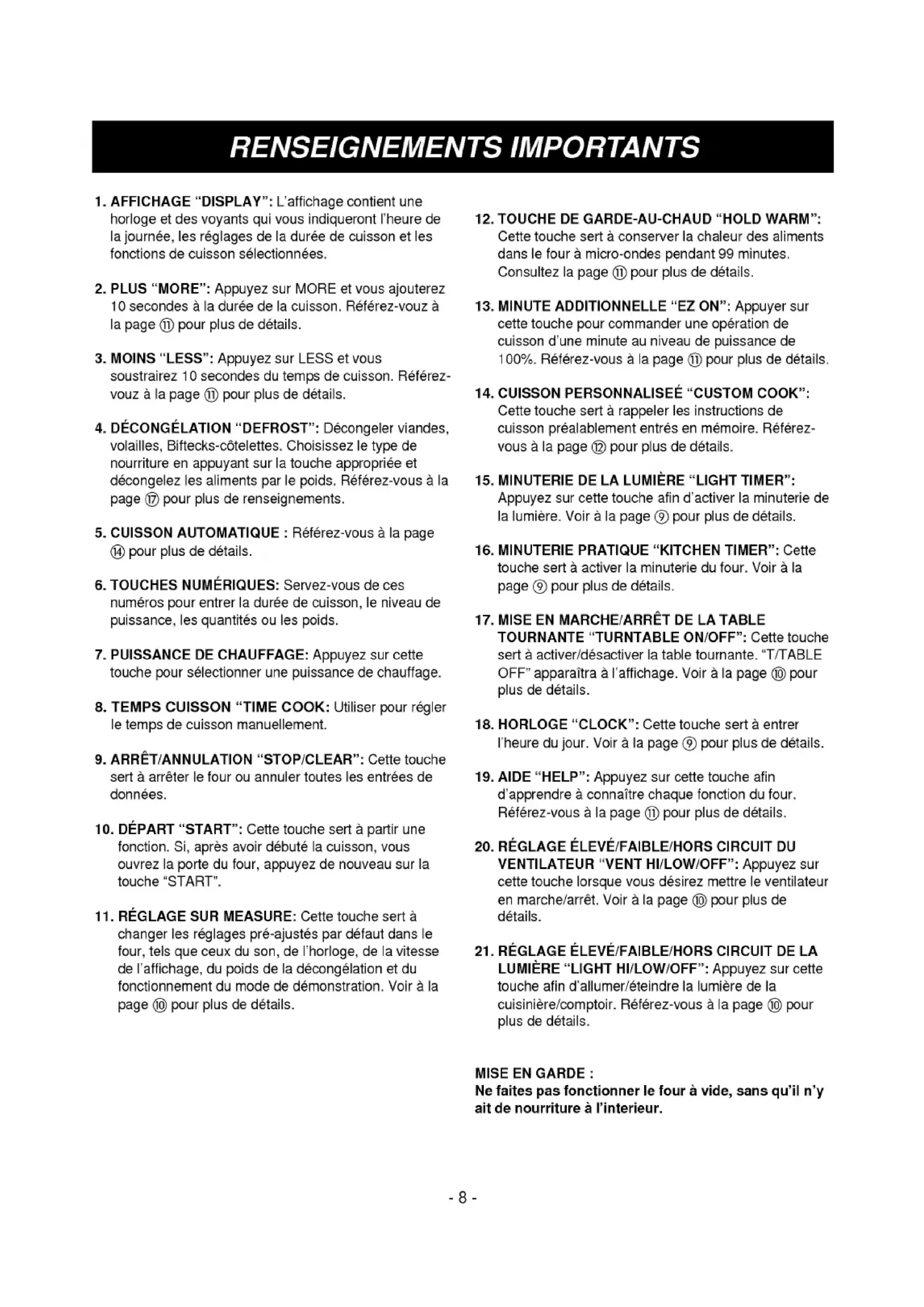Popcorn RENSEIGNEMENTS IMPORTANTS-8- 1.AFFICHAGE"DISPLAY": L'affichage contientune horloge etdes voyants qui vous indiqueront l'heuredela journee, les reglages deladureedecuissonetlesfonctionsdecuissonselectionnees.2.PLUS"MORE": Appuyez surMOREetvous ajouterez 10secondesaladureedelacuisson.Referez-vouzalapagepour plus dedetails.3.MOINS"LESS": Appuyez surLESSetvoussoustrairez10secondesdu temps decuisson.Referez-vouzalapagepour plus dedetails.4. DECONGELATION "DEFROST": Decongeler viandes, volailles, Biftecks-cotelettes.Choisissezle type denourritureen appuyant surlatouche appropriee decongelez lesalimentsparle poids. Referez-vousalapagepour plus renseignements. 5.CUISSON AUTOMATIQUE