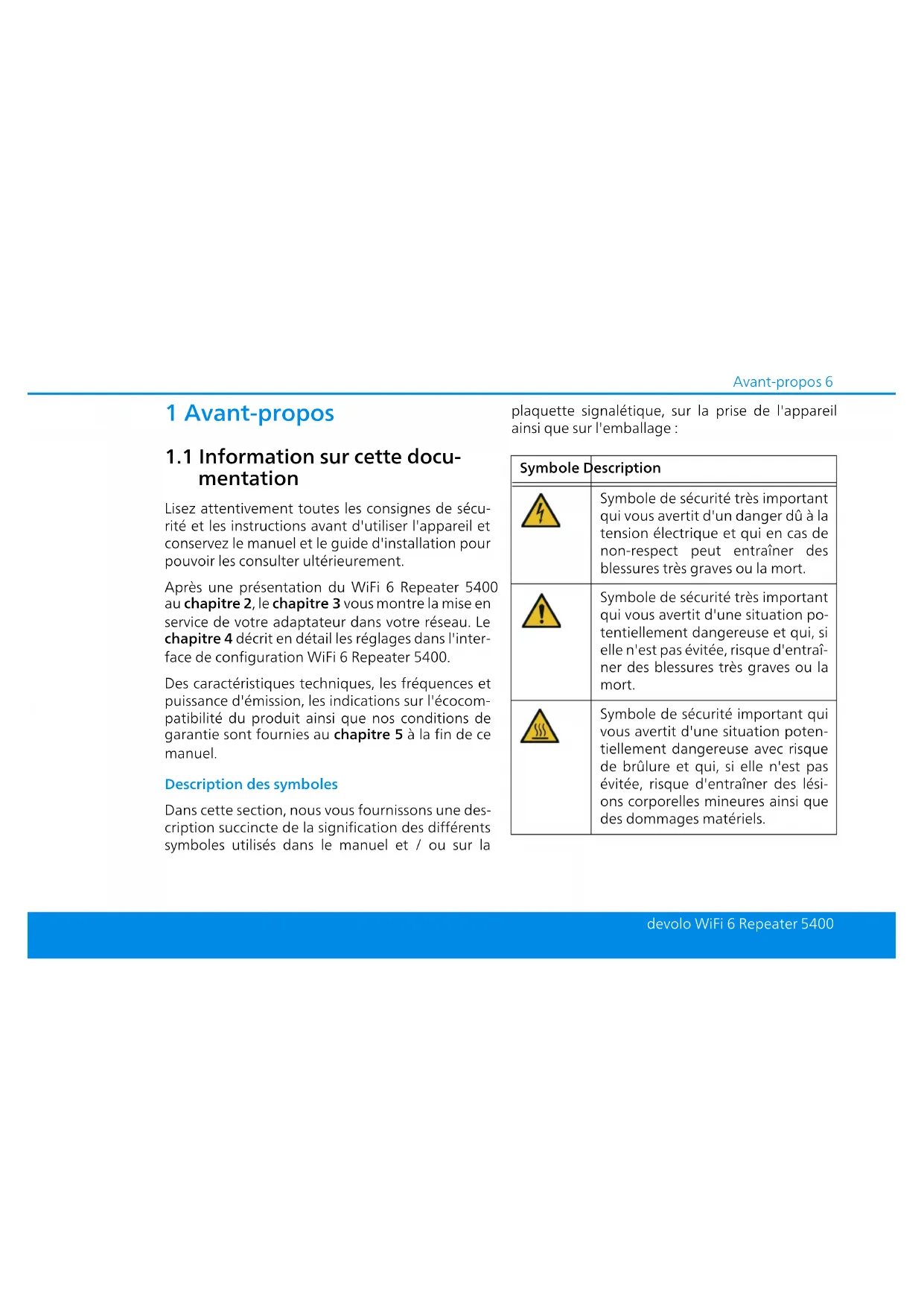 face de configuration WiFi 6 Repeater 5400. Des caractéristiques techniques, les fréquences et puissance d'émission, les indications sur l'écocom- patibilité du produit ainsi que nos conditions de garantie sont fournies au chapitre 5 à la fin de ce manuel. Description des symboles Dans cette section, nous vous fournissons une des- cription succincte de la signification des différents symboles utilisés dans le manuel et / ou sur la plaquette signalétique, sur la prise de l'appareil ainsi que sur l'emballage : Symbole Description Symbole de sécurité très important qui vous avertit d'un danger dû à la tension électrique et qui en cas de non-respect peut entraîner des blessures très graves ou la mort. Symbole de sécurité très important qui vous avertit d'une situation po- tentiellement dangereuse et qui, si elle n'est pas évitée, risque d'entraî- ner des blessures très graves ou la mort. Symbole de sécurité important qui vous avertit d'une situation poten- tiellement dangereuse avec risque de brûlure et qui, si elle n'est pas évitée, risque d'entraîner des lési- ons corporelles mineures ainsi que des dommages matériels. WiFi_6_Repeater_5400.book Seite 6 Freitag, 3. Juni 2022 10:43 107 Avant-propos devolo WiFi 6 Repeater 5400 Symbole de sécurité très important qui vous avertit d'une situation po- tentiellement dangereuse assortie d'un risque de trébuchement qui peut entraîner des blessures. Remarque importante qui signale le risque éventuel de dommages matériels et dont il est recom- mandé de tenir compte. L'appareil ne doit être utilisé que dans des locaux secs et fermés. Applicable uniquement aux ap- pareils avec WiFi dans la bande 5GHz: Les connexions WiFi dans la bande 5 GHz de 5,15 à 5,35 GHz sont ex- clusivement destinées à être utili- sées à l'intérieur de locaux fermés. Symbole Description L'appareil est un produit de la clas- se de protection II. Les parties du boîtier (en métal) conductrices d‘électricité peuvent, en cas de dé- faut, être sous tension pendant le fonctionnement ou la maintenan- ce. Ces parties sont donc séparées des éléments sous tension par une isolation renforcée. Par le marquage CE, le fabricant / le responsable de la mise en circulati- on déclare que le produit est con- forme aux directives européennes en vigueur et qu'il a été soumis aux procédures d'évaluation de la con- formité prescrites. Symbole Description WiFi_6_Repeater_5400.book Seite 7 Freitag, 3. Juni 2022 10:43 10Avant-propos 8 devolo WiFi 6 Repeater 5400
