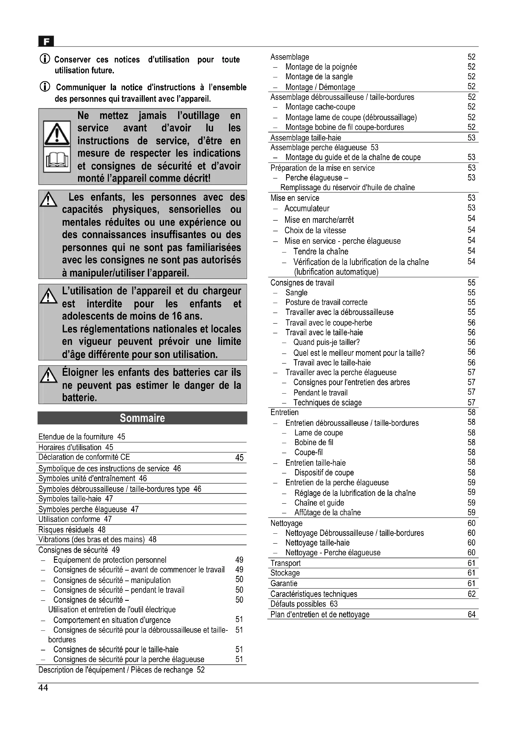 Conserver ces notices d’utilisation pour toute utilisation future. Communiquer la notice d'instructions à l’ensemble des personnes qui travaillent avec l’appareil. Ne mettez jamais l’outillage en service avant d’avoir lu les instructions de service, d’être en mesure de respecter les indications et consignes de sécurité et d’avoir monté l’appareil comme décrit! Les enfants, les personnes avec des capacités physiques, sensorielles ou mentales réduites ou une expérience ou des connaissances insuffisantes ou des personnes qui ne sont pas familiarisées avec les consignes ne sont pas autorisés à manipuler/utiliser l’appareil. L’utilisation de l’appareil et du chargeur est interdite pour les enfants et adolescents de moins de 16 ans. Les réglementations nationales et locales en vigueur peuvent prévoir une limite d’âge différente pour son utilisation. Éloigner les enfants des batteries car ils ne peuvent pas estimer le danger de la batterie. Sommaire Etendue de la fourniture 45 Horaires d'utilisation 45 Déclaration de conformité CE Symbolique de ces instructions de service 46 Symboles unité d'entraînement 46 Symboles débroussailleuse / taille-bordures type 46 Symboles taille-haie 47 Symboles perche élagueuse 47 Utilisation conforme 47 Risques résiduels 48 Vibrations (des bras et des mains) 48 Consignes de sécurité 49 Equipement de protection personnel Consignes de sécurité – avant de commencer le travail Consignes de sécurité – manipulation Consignes de sécurité – pendant le travail Consignes de sécurité –Utilisation et entretien de l'outil électrique Comportement en situation d’urgence Consignes de sécurité pour la débroussailleuse et taille-bordures Consignes de sécurité pour le taille-haie Consignes de sécurité pour la perche élagueuse Description de l'équipement / Pièces de rechange 52 Assemblage 52 Montage de la poignée Montage de la sangle Montage / Démontage Assemblage débroussailleuse / taille-bordures 52 Montage cache-coupe Montage lame de coupe (débroussaillage) Montage bobine de fil coupe-bordures Assemblage taille-haie 53 Assemblage perche élagueuse 53 Montage du guide et de la chaîne de coupe Préparation de la mise en service 53 Perche élagueuse –Remplissage du réservoir d'huile de chaîne Mise en service 53 Accumulateur