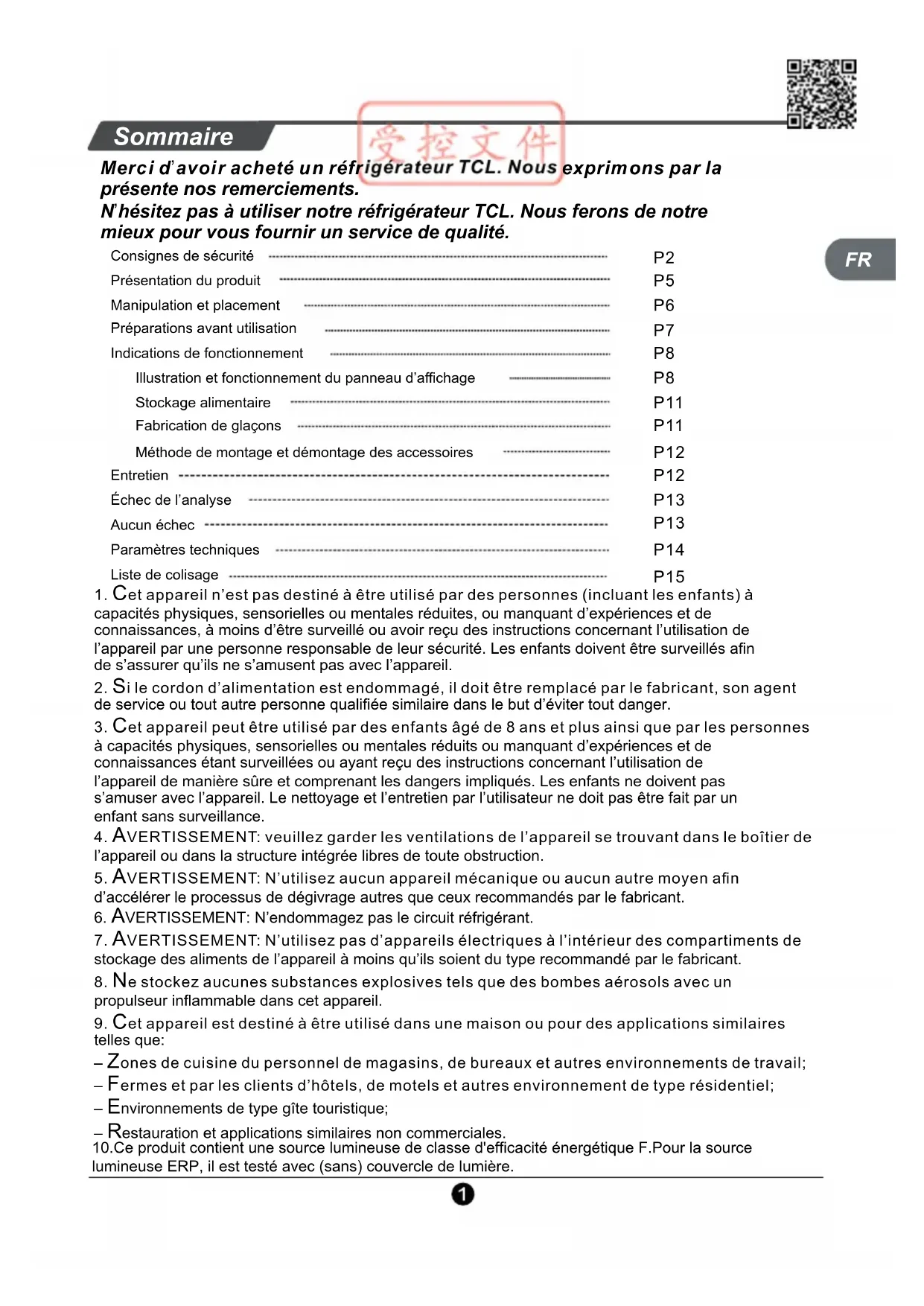 N’hésitez pas à utiliser notre réfrigérateur TCL. Nous ferons de notre mieux pour vous fournir un service de qualité. Consignes de sécurité Manipulation et placement Illustration et fonctionnement du panneau d’affichage Fabrication de glaçons Méthode de montage et démontage des accessoires Entretien Échec de l’analyse Aucun échec Paramètres techniques Liste de colisage Présentation du produit Préparations avant utilisation Indications de fonctionnement Stockage alimentaire