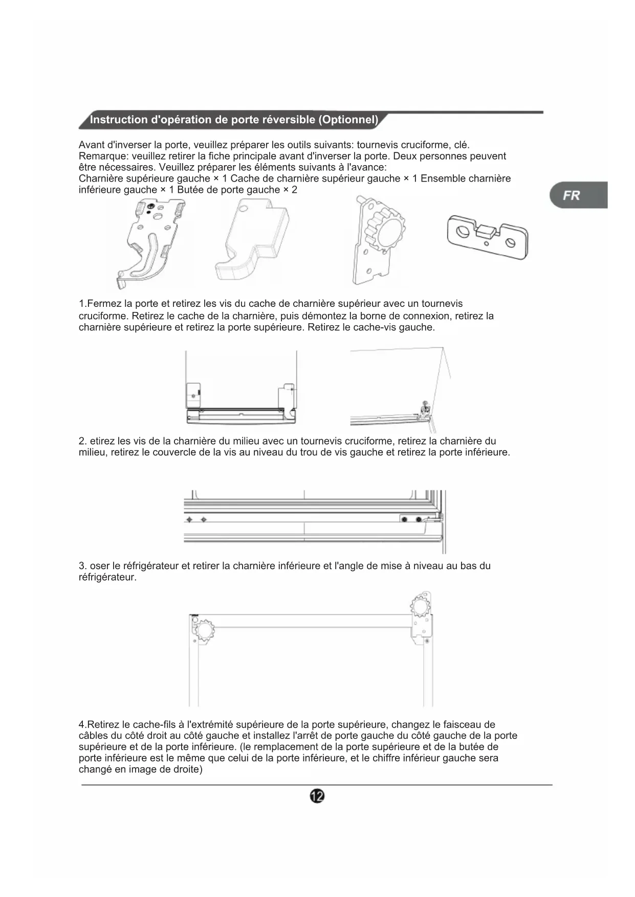 fant Économie d’énergie Réglage déverrouiller Pressez 3 secondes pour(Optionnel)Instruction d'opération de porte réversible (Optionnel) Avant d'inverser la porte, veuillez préparer les outils suivants: tournevis cruciforme, clé. Remarque: veuillez retirer la fiche principale avant d'inverser la porte. Deux personnes peuvent être nécessaires. Veuillez préparer les éléments suivants à l'avance: Charnière supérieure gauche × 1 Cache de charnière supérieur gauche × 1 Ensemble charnière inférieure gauche × 1 Butée de porte gauche × 2 1.Fermez la porte et retirez les vis du cache de charnière supérieur avec un tournevis cruciforme. Retirez le cache de la charnière, puis démontez la borne de connexion, retirez la charnière supérieure et retirez la porte supérieure. Retirez le cache-vis gauche.