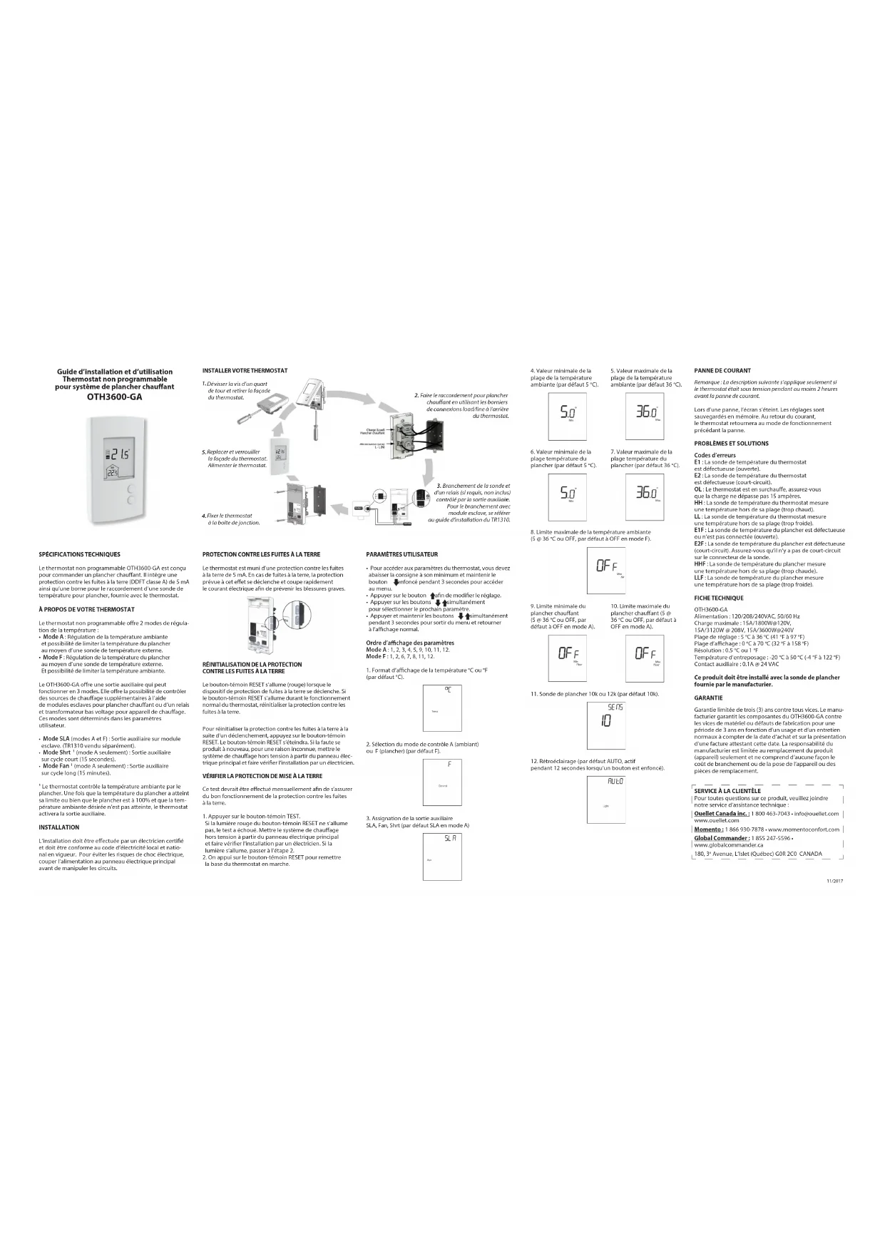 Codes d’erreurs E1 : La sonde de température du thermostat est défectueuse (ouverte). E2 : La sonde de température du thermostat est défectueuse (court-circuit). OL : Le thermostat est en surchaue, assurez-vous que la charge ne dépasse pas 15 ampères. HH : La sonde de température du thermostat mesure une température hors de sa plage (trop chaud). LL : La sonde de température du thermostat mesure une température hors de sa plage (trop froide). E1F : La sonde de température du plancher est défectueuse ou n’est pas connectée (ouverte). E2F : La sonde de température du plancher est défectueuse (court-circuit). Assurez-vous qu’il n’y a pas de court-circuit sur le connecteur de la sonde. HHF : La sonde de température du plancher mesure une température hors de sa plage (trop chaude). LLF : La sonde de température du plancher mesure une température hors de sa plage (trop froide). FICHE TECHNIQUE OTH3600-GA Alimentation : 120/208/240VAC, 50/60 Hz Charge maximale : 15A/1800W@120V, 15A/3120W @ 208V, 15A/3600W@240V Plage de réglage : 5 °C à 36 °C (41 °F à 97 °F) Plage d’achage : 0 °C à 70 °C (32 °F à 158 °F) Résolution : 0.5 °C ou 1 °F Température d’entreposage : -20 °C à 50 °C (-4 °F à 122 °F) Contact auxiliaire : 0.1A @ 24 VAC Ce produit doit être installé avec la sonde de plancher fournie par le manufacturier. GARANTIE Garantie limitée de trois (3) ans contre tous vices. Le manu- facturier garantit les composantes du OTH3600-GA contre les vices de matériel ou défauts de fabrication pour une période de 3 ans en fonction d’un usage et d’un entretien normaux à compter de la date d’achat et sur la présentation d’une facture attestant cette date. La responsabilité du manufacturier est limitée au remplacement du produit (appareil) seulement et ne comprend d’aucune façon le coût de branchement ou de la pose de l’appareil ou des pièces de remplacement.