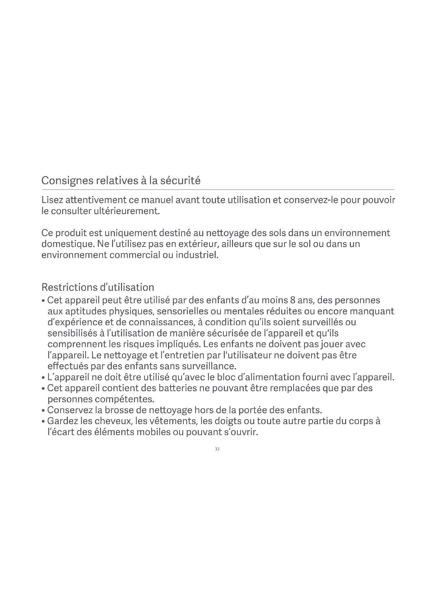 - Gardez les cheveux, les vêtements, les doigts ou toute autre partie du corps à l’écart des éléments mobiles ou pouvant s’ouvrir. Lisez aentivement ce manuel avant toute utilisation et conservez-le pour pouvoir le consulter ultérieurement. Ce produit est uniquement destiné au neoyage des sols dans un environnement domestique. Ne l’utilisez pas en extérieur, ailleurs que sur le sol ou dans un environnement commercial ou industriel.34