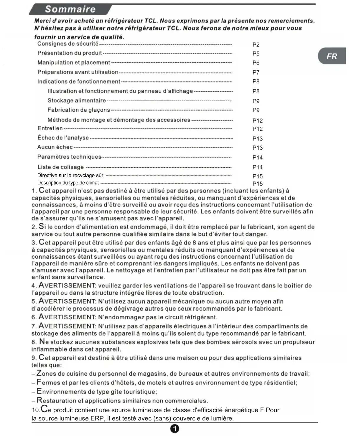 RF318BWF0 - Réfrigérateur TCL - Notice d'utilisation et mode d'emploi gratuit