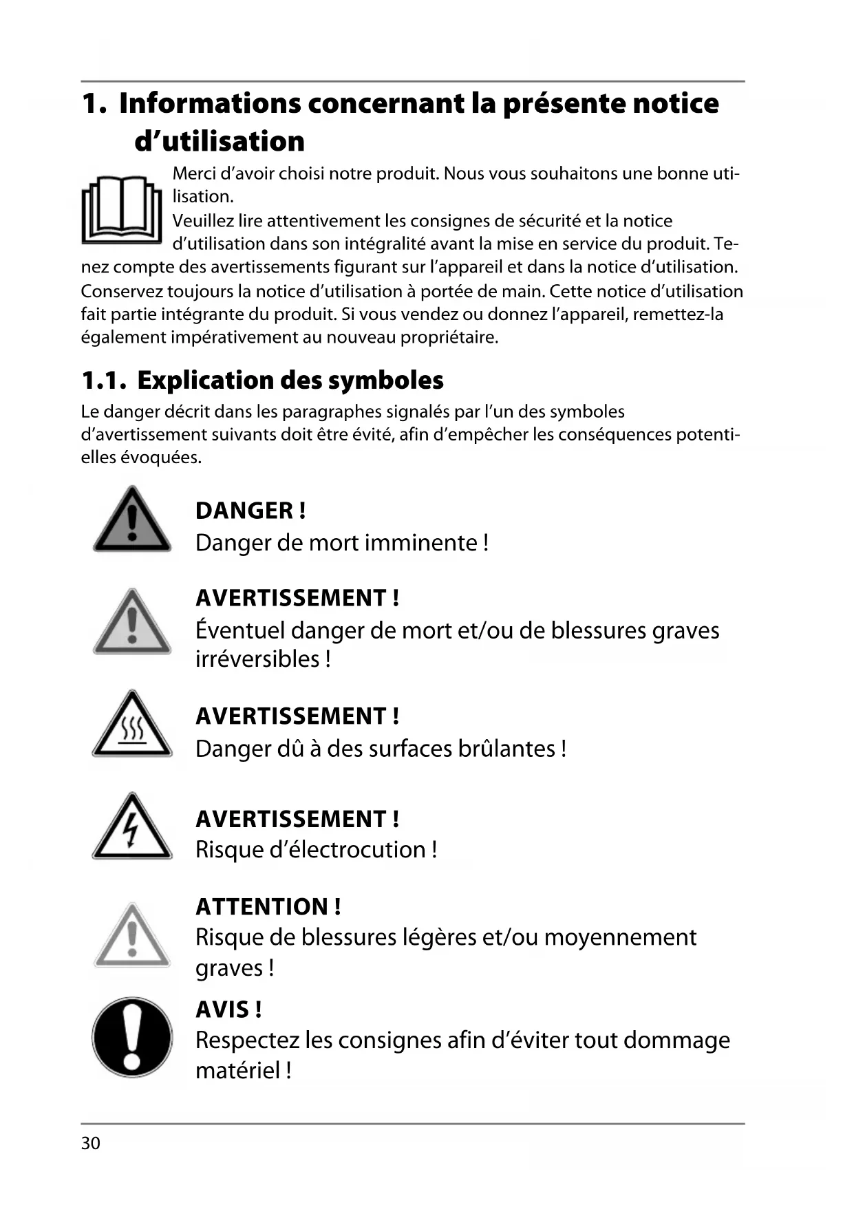 1. Informations concernant la présente notice d’utilisation ...................... 30