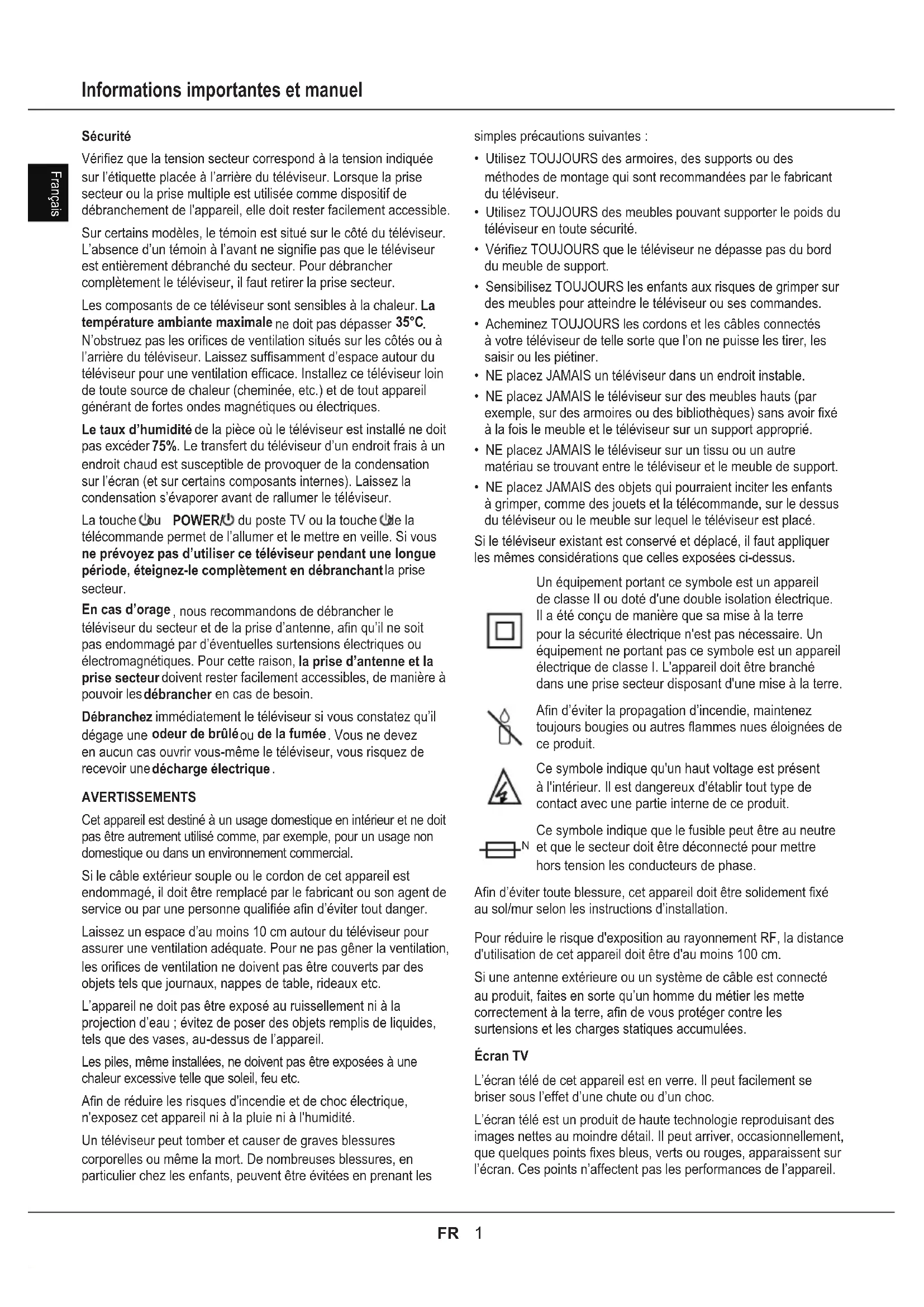 Ce symbole indique que le fusible peut être au neutre et que le secteur doit être déconnecté pour mettre hors tension les conducteurs de phase. An d’éviter toute blessure, cet appareil doit être solidement xé au sol/mur selon les instructions d’installation. Pour réduire le risque d'exposition au rayonnement RF, la distance d'utilisation de cet appareil doit être d'au moins 100 cm. Si une antenne extérieure ou un système de câble est connecté au produit, faites en sorte qu’un homme du métier les mette correctement à la terre, an de vous protéger contre les surtensions et les charges statiques accumulées. Écran TV L’écran télé de cet appareil est en verre. Il peut facilement se briser sous l’effet d’une chute ou d’un choc. L’écran télé est un produit de haute technologie reproduisant des images nettes au moindre détail. Il peut arriver, occasionnellement, que quelques points xes bleus, verts ou rouges, apparaissent sur l’écran. Ces points n’affectent pas les performances de l’appareil. Informations importantes et manuelFR
