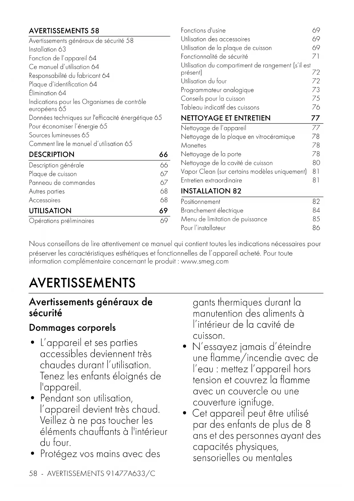 Nettoyage de l’appareil 77 Nettoyage de la plaque en vitrocéramique 78 Manettes 78 Nettoyage de la porte 78 Nettoyage de la cavité de cuisson 80 Vapor Clean (sur certains modèles uniquement) 81 Entretien extraordinaire 81 INSTALLATION 82 Positionnement 82 Branchement électrique 84 Menu de limitation de puissance 85 Pour l’installateur 86 Nous conseillons de lire attentivement ce manuel qui contient toutes les indications nécessaires pour préserver les caractéristiques esthétiques et fonctionnelles de l’appareil acheté. Pour toute information complémentaire concernant le produit : www.smeg.com AVERTISSEMENTS Avertissements généraux de sécurité Dommages corporels