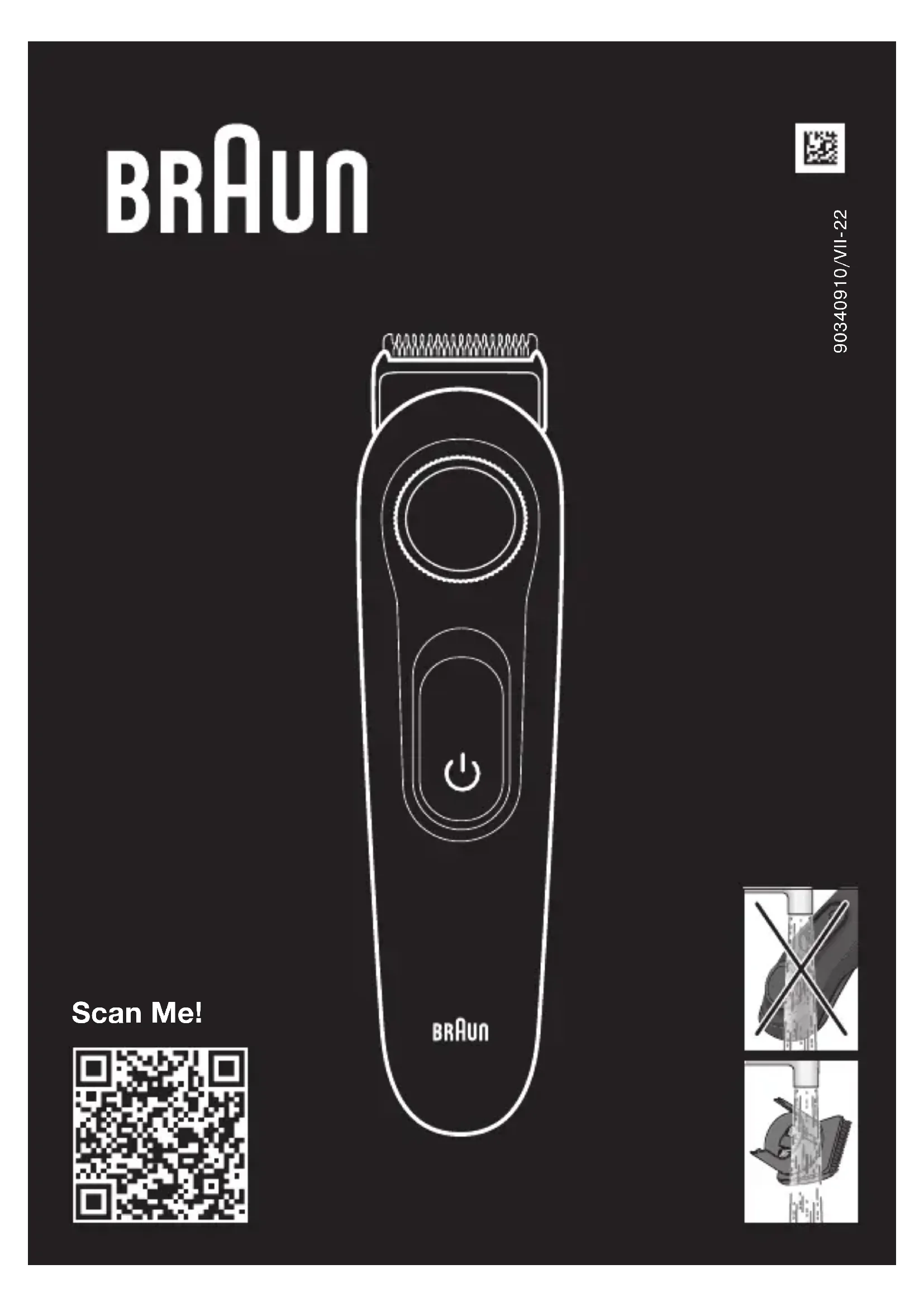 - not with all models ** design can differ For electric specifications, see printing on the special cord set. Environmental notice Product contains batteries and/or recyclable electric waste. For environment protection do not dispose of in household waste, but for recycling take to electric waste collection points provided in your country. Subject to change without notice. 90340910_Type5516_BT3421_3420_3411_3410_3400x_CEEMEA.indd 1190340910_Type5516_BT3421_3420_3411_3410_3400x_CEEMEA.indd 11 20.07.22 10:0320.07.22 10:0312 Guarantee We grant a 2-year guarantee on the product commencing on the date of purchase. Within the guarantee period we will eliminate any defects in the appliance resulting from faults in materials or workmanship, free of charge either by repairing or replacing the complete appliance at our discretion. Depending on availability replacement might result in a different color or an equivalent model. This guarantee extends to every country where this appliance is supplied by Braun or its appointed distributor. This guarantee does not cover: damage due to improper use, normal wear and tear (e.g. shaver foil or cutter block) as well as defects that have a negligible effect on the value or operation of the appliance. The guarantee becomes void if repairs are undertaken by unauthorised persons and if original Braun parts are not used. To obtain service within the guarantee period, hand in or send the complete appliance with your sales receipt to an authorised Braun Customer Service Centre (address infor- mation available online at www.service.braun.com). For UK only: This guarantee in no way affects your rights under statutory law. 90340910_Type5516_BT3421_3420_3411_3410_3400x_CEEMEA.indd 1290340910_Type5516_BT3421_3420_3411_3410_3400x_CEEMEA.indd 12 20.07.22 10:0320.07.22 10:0313 Français Lisez attentivement ces instructions car elles contiennent des informations de sécurité. Conservez-les pour une consultation ultérieure. ATTENTION Cet appareil est fourni avec un câble d’alimentation élec- trique à Très Basse Tension de Sécurité. Ne changez ou ne manipulez aucune partie de ce dernier, sous risque de recevoir un choc électrique. Utilisez uniquement le câble spécial fourni avec votre appareil. Les chiffres dans/près de ce symbole doivent correspondre aux chiffres sur le bloc d’alimentation. Ne jamais utiliser l’appareil avec un accessoire endom- magé, tel que les lames, les sabots ou le câble d’alimenta- tion spécial. Gardez l’appareil au sec. N’ouvrez pas l’appareil ! Cet appareil contient des batteries non remplaçables. Cet appareil peut être utilisé par des enfants à partir de 8 ans et des personnes avec une réduction des capacités physiques, sensorielles ou mentales, ou sans expérience et connaissances, s’ils ont bénéficié d’une surveillance ou d’instructions concernant l’utilisation de l’appareil en toute sécurité et comprennent les dangers encourus. Si l’appareil est fourni avec un accessoire tondeuse à cheveux, il peut être utilisé par des enfants âgés de 3 ans et plus sous surveillance. Les enfants ne doivent pas jouer avec cet appareil. Les opérations de nettoyage et de maintenance ne doivent pas 90340910_Type5516_BT3421_3420_3411_3410_3400x_CEEMEA.indd 1390340910_Type5516_BT3421_3420_3411_3410_3400x_CEEMEA.indd 13 20.07.22 10:0320.07.22 10:0314 être effectuées par des enfants à moins qu’ils ne soient sous surveillance. Destiné à un usage domestique uniquement. Avertissements Lors de la recharge, assurez-vous que l’appareil est éteint. Important La température ambiante recommandée pour la recharge est comprise entre 5 et 35 °C. La batterie ne se rechargera pas correctement, voire pas du tout, à des températures trop basses ou trop élevées. La température ambiante recommandée pour la tonte est comprise entre 15 et 35 °C. Ne pas soumettre l’appareil à une température supérieure à 50 °C pendant une durée prolongée. Pour préserver le bon fonctionnement des accessoires, appliquez régulièrement une goutte d’huile de machine légère (non fournie) sur la tondeuse et les grilles. Description 1a Tête tondeuse*/** 1b Tête tondeuse de précision*/** 1c Tête de mini rasoir à grille* 2 Bouton de réglage des longueurs 3 Bouton marche/arrêt 4 Prise 5 Câble d’alimentation** 6 Indicateur de charge 7 Sabot de précision pour barbe (0,5-10 mm)*/** 8 Sabot de précision pour cheveux (10,5-20 mm)*/**