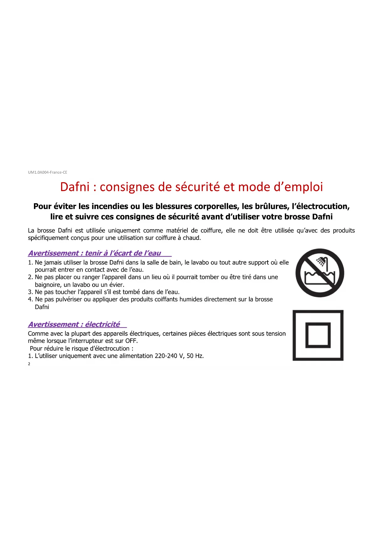 2. Lorsque la brosse Dafni a refroidi, pliez le cordon d’alimentation tel qu’il était lorsqu’il a été livré la première fois dans son emballage. Ne pas enrouler le cordon d’alimentation autour de la brosse Dafni car cela peut le tendre et provoquer une défaillance prématurée de ce dernier. Défaut de fonctionnement La brosse DAFNI est un appareil de haute performance. Si l’appareil est soumis à une importante fluctuation du secteur électrique lors de son utilisation, il peut passer en mode de sécurité pour protéger l’appareil des dommages. Par conséquent, dans le cas peu probable où votre appareil DAFNI ne fonctionne pas correctement, vérifier à la fois que l’appareil et le réseau d’alimentation sont allumés et que l’électricité fonctionne.UM1.0A004-France-CE