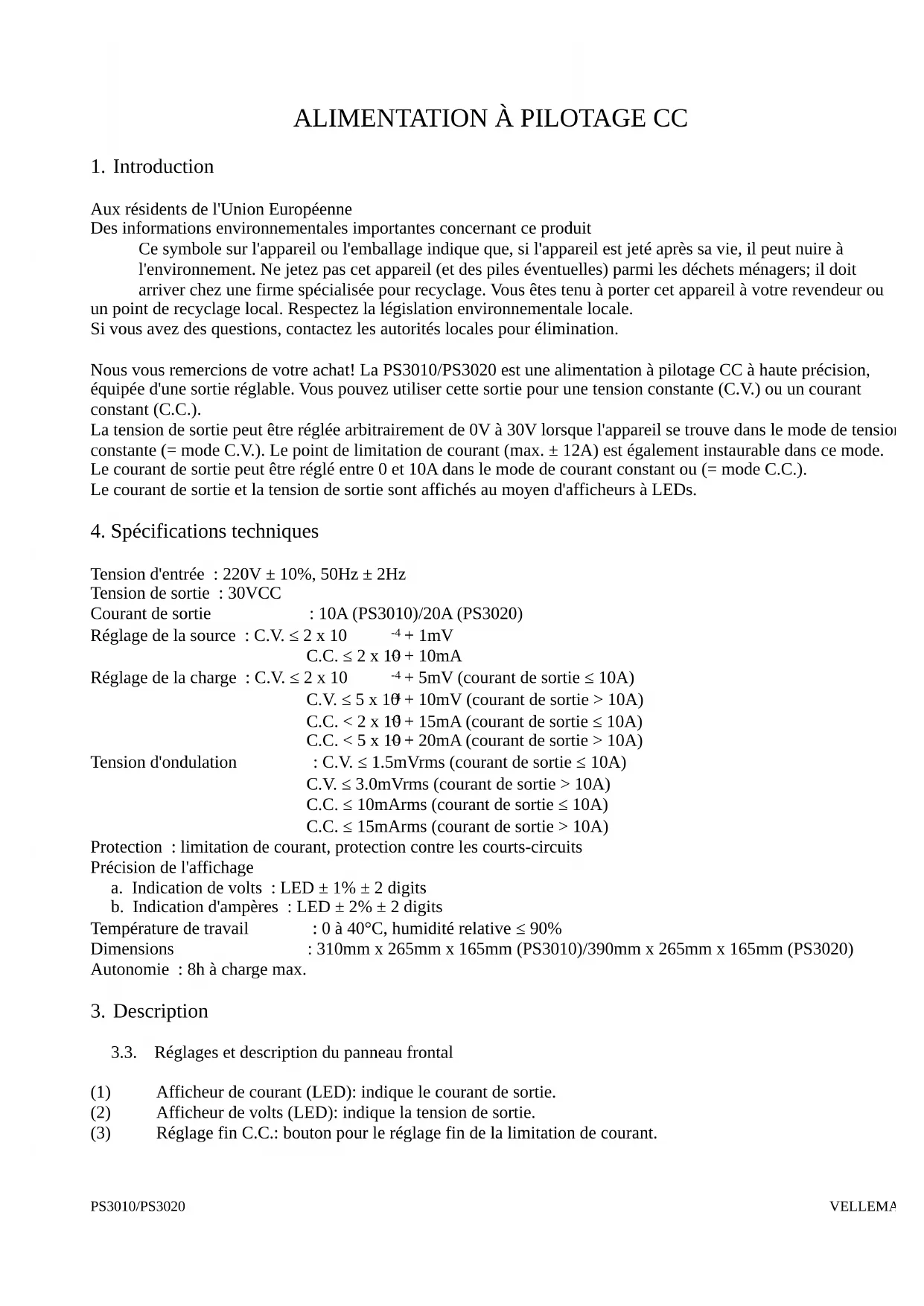 Retrouvez gratuitement la notice de l'appareil PS3020 VELLEMAN au format PDF.