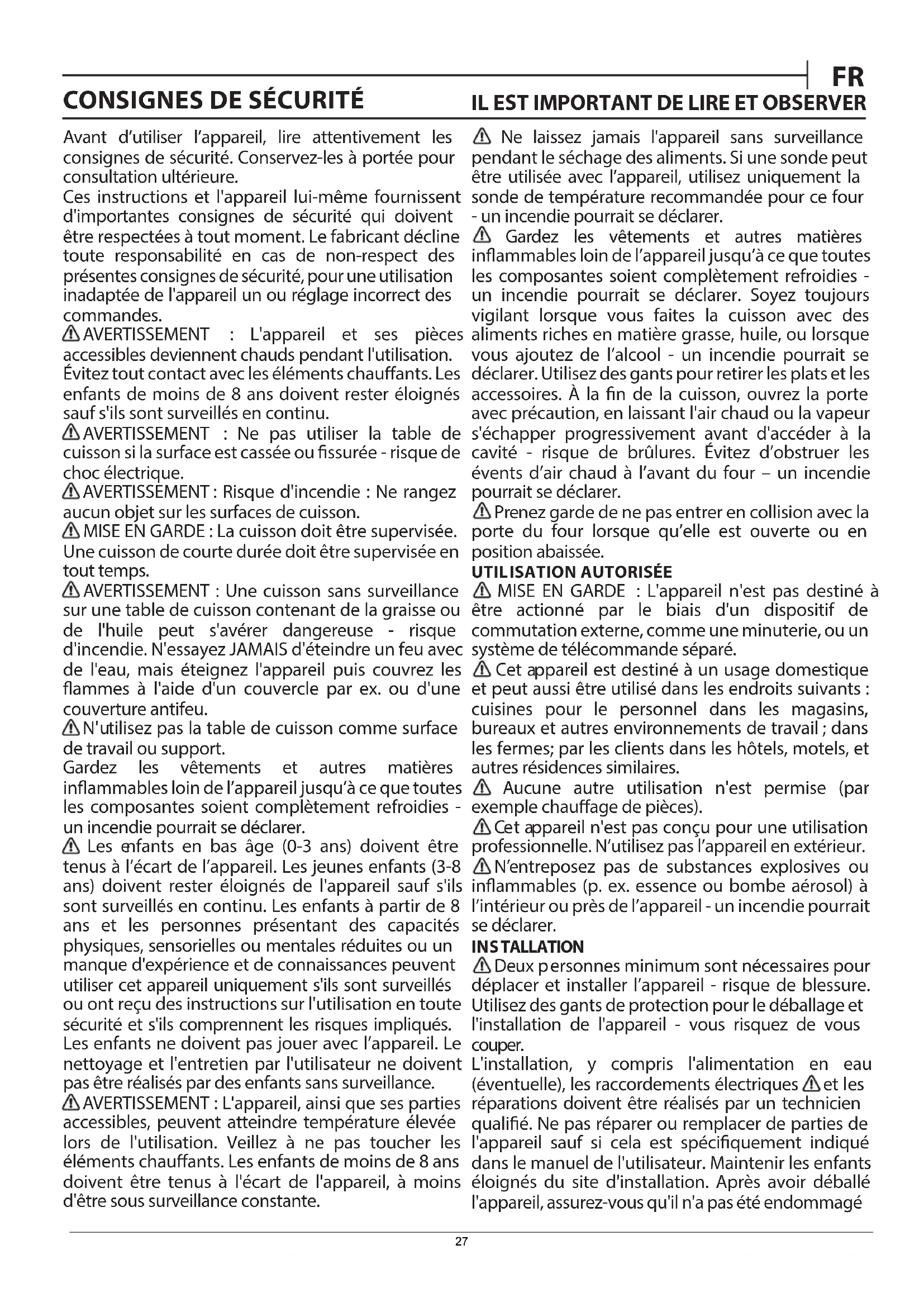 Ava nt d’utiliser l’appareil, lire attentivement les consignes de sécurité. Conservez-les à portée pour consultation ultérieure. Ces instructions et l'appareil lui-même fournissent d'importantes consignes de sécurité qui doivent être respectées à tout moment. Le fabricant décline toute responsabilité en cas de non-respect des présentes consignes de sécurité, pour une utilisation inadaptée de l'appareil un ou réglage incorrect des commandes. AVE RTISSEMENT : L'appareil et ses pièces accessibles deviennent chauds pendant l'utilisation. Évitez tout contact avec les éléments chauants. Les enfants de moins de 8 ans doivent rester éloignés sauf s'ils sont surveillés en continu.
