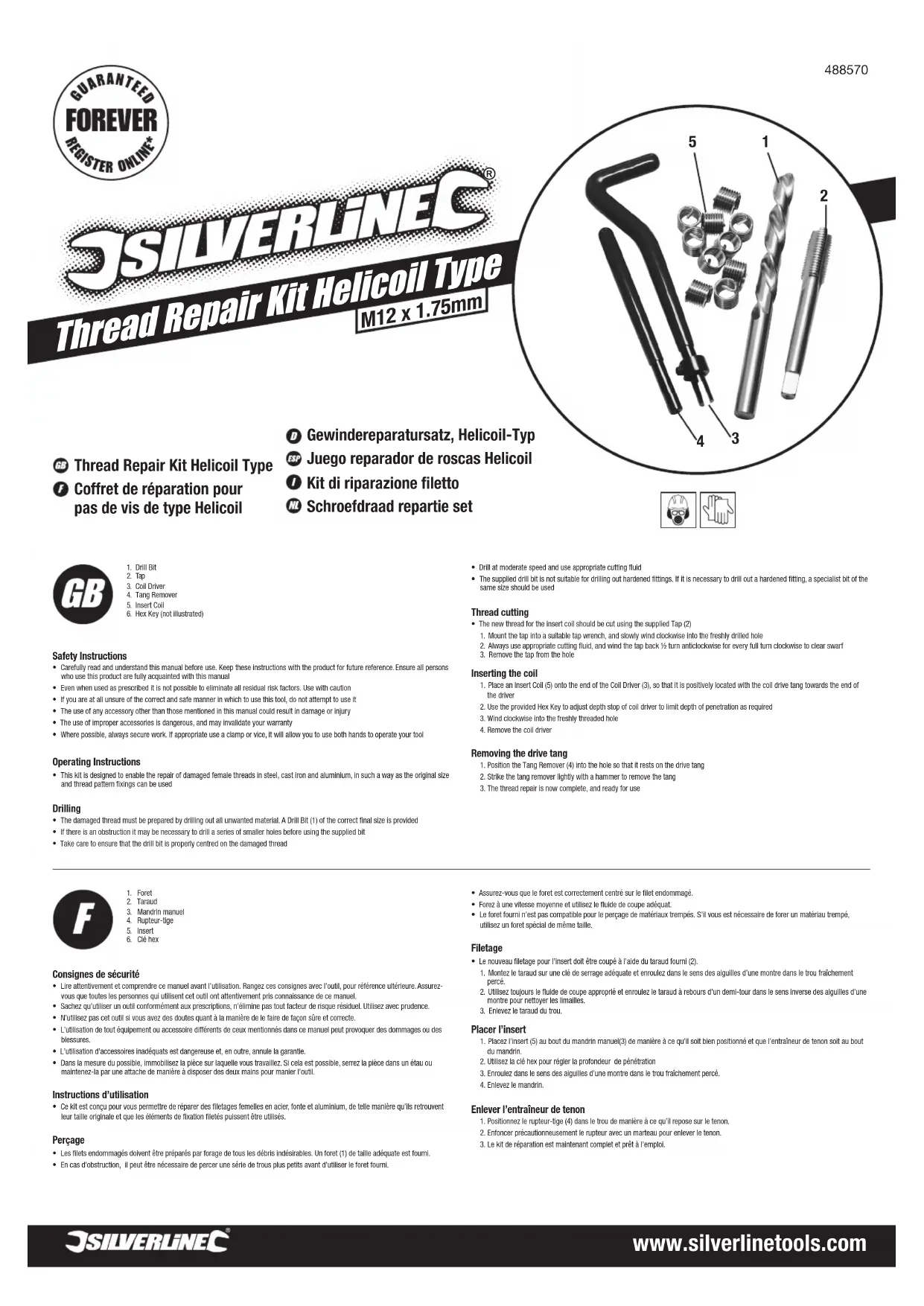 - Le foret fourni n’est pas compatible pour le perçage de matériaux trempés. S’il vous est nécessaire de forer un matériau trempé, utilisez un foret spécial de même taille.Filetage• Le nouveau filetage pour l’insert doit être coupé à l’aide du taraud fourni (2). 1. Montez le taraud sur une clé de serrage adéquate et enroulez dans le sens des aiguilles d’une montre dans le trou fraîchement percé. 2. Utilisez toujours le fluide de coupe approprié et enroulez le taraud à rebours d’un demi-tour dans le sens inverse des aiguilles d’une montre pour nettoyer les limailles.3. Enlevez le taraud du trou.Placer l’insert 1. Placez l’insert (5) au bout du mandrin manuel(3) de manière à ce qu’il soit bien positionné et que l’entraîneur de tenon soit au bout du mandrin.2. Utilisez la clé hex pour régler la profondeur de pénétration 3. Enroulez dans le sens des aiguilles d’une montre dans le trou fraîchement percé.4. Enlevez le mandrin.Enlever l’entraîneur de tenon1. Positionnez le rupteur-tige (4) dans le trou de manière à ce qu’il repose sur le tenon.2. Enfoncer précautionneusement le rupteur avec un marteau pour enlever le tenon.3. Le kit de réparation est maintenant complet et prêt à l’emploi.1. Foret2. Taraud3. Mandrin manuel4. Rupteur-tige5. Insert6. Clé hexConsignes de sécurité