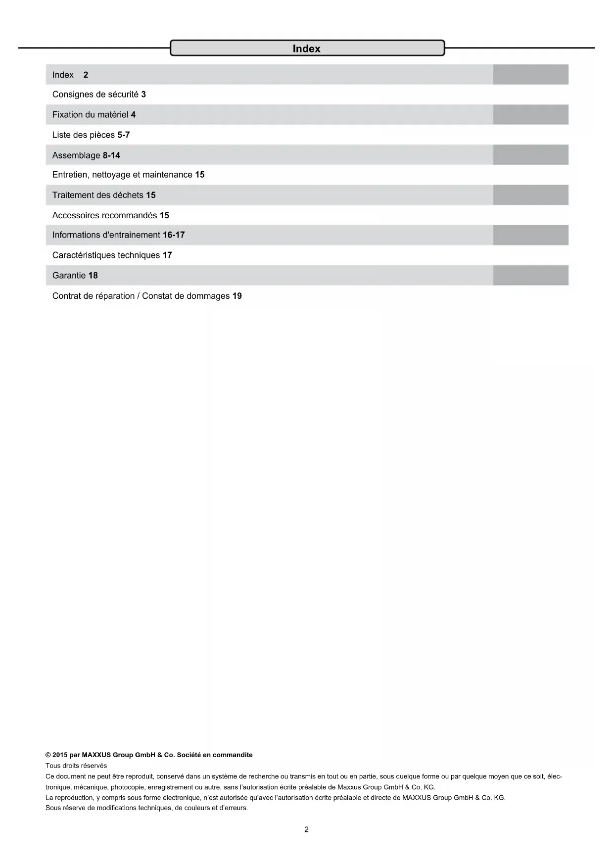 FRA Multi-Trainer Pro Instructions d’assemblage2 Index Index 2 Consignes de sécurité 3 Fixation du matériel 4 Liste des pièces 5-7 Assemblage 8-14 Entretien, nettoyage et maintenance 15 Traitement des déchets 15 Accessoires recommandés 15 Informations d'entrainement 16-17 Caractéristiques techniques 17 Garantie 18 Contrat de réparation / Constat de dommages 19 © 2015 par MAXXUS Group GmbH & Co. Société en commandite Tous droits réservés Ce document ne peut être reproduit, conservé dans un système de recherche ou transmis en tout ou en partie, sous quelque forme ou par quelque moyen que ce soit, élec- tronique, mécanique, photocopie, enregistrement ou autre, sans l’autorisation écrite préalable de Maxxus Group GmbH & Co. KG. La reproduction, y compris sous forme électronique, n’est autorisée qu’avec l’autorisation écrite préalable et directe de MAXXUS Group GmbH & Co. KG. Sous réserve de modications techniques, de couleurs et d’erreurs.3 FRA Veuillez lire et respecter toutes les sections de ce manuel d’utilisation. Une attention particulière doit être accordée aux ins- tructions de sécurité, d’entretien et maintenance ainsi qu’aux informations d’entraînement. Veuillez vous assurer que toute personne utilisant l’équipement sportif ait lu et respecte ces instructions. Conservez ce manuel dans un endroit sûr pour une consultation ultérieure, pour toute information complémentaire générale, sur l’entretien et le nettoyage et pour obtenir des détails sur la commande de pièces de rechange. Il est essentiel de respecter strictement les instructions d’entretien et de maintenance présentes dans ce manuel. Cet équipement sportif ne doit être utilisé qu’à ses ns prévues. Cela signie qu’il ne doit être utilisé que par des adultes pour des séances d’entraînement musculaire. Une utilisation de cet équipement à d’autres ns que celles prévues peut entraîner un risque d’accident, une atteinte à la santé ou un endommagement de l’appareil. Le fournisseur ne pourra être tenu responsable en ce cas. Environnement d’entraînement − Choisissez un emplacement adéquat pour votre appareil sportif, orant un espace optimal et une sécurité maximale. − Assurez-vous que la capacité de charge du sol ou de la zone choisie est susante pour supporter le poids de l’équipement. − Assurez-vous que l’endroit soit bien aéré et que l’apport en oxygène lors de l’entraînement soit susant. Evitez les courants d’air. − N’installez pas votre appareil d’entraînement dans des endroits passants ou à proximité de passages principaux (issues de se- cours, portes ou couloirs) − Votre appareil ne convient pas pour une utilisation en extérieur. Il doit être utilisé et rangé uniquement dans un environnement tempéré, sec et propre. − L’appareil ne peut être utilisé ou rangé dans un endroit humide, comme une piscine, un sauna, etc. − Assurez-vous que votre appareil soit sur un sol xe, plat et propre, qu’il soit utilisé ou non. Toute inégalité du sol doit être enlevée ou compensée. − An de protéger les sols fragiles tels que le parquet, le stratié, le carrelage, etc., il est recommandé de toujours placer une pro- tection sur le sol (morceau de moquette, tapis, etc.) sous l’appareil. Nous recommandons de placer le tapis de protection de sol MAXXUS® de manière permanente en dessous de votre appareil. Assurez-vous que cette couche ne puisse pas glisser. − Ne placez pas l’appareil sur une moquette ou un tapis de couleurs claires car les pieds de celui-ci peuvent laisser des traces. − Assurez-vous que votre appareil ainsi que le câble secteur ne soient pas en contact avec des objets chauds et qu’ils soient placés à une distance sûre de toute source de chaleur, telle qu’un radiateur, un poêle, une cheminée ouverte, etc. Consignes de sécurité de la personne lors de l’entraînement − Il est conseillé d’eectuer une visite médicale avant de commencer l’entraînement. − Interrompez immédiatement l’entraînement si vous ressentez un malaise ou des dicultés respiratoires. − Commencez toujours vos séances par un eort moindre et augmentez progressivement et régulièrement l’intensité. Réduisez à nouveau l’intensité vers la n de votre séance d’entraînement. − Assurez-vous de porter des vêtements et des chaussures adéquates. Veuillez noter que des vêtements larges pourraient se coin- cer dans les éléments mobiles de l’appareil. − Votre équipement sportif ne peut être utilisé que par une seule personne à la fois. − Vériez toujours que votre appareil est en parfait état avant de commencer votre séance. Ne l’utilisez jamais s’il présente une anomalie ou s’il est défectueux. − Vous n’êtes autorisé à eectuer des réparations qu’avec l’autorisation préalable de notre service de maintenance. Vous devez utiliser exclusivement les pièces de rechange originales. − Des réparations ou des modications structurelles inappropriées (xation de pièces non autorisées, démontage de pièces d’origine, etc.) ne sont pas autorisées. Cela peut compromettre la sécurité technique de l’appareil et entraîner des risques pour l’utilisateur. − Votre appareil doit être nettoyé après chaque utilisation. Veillez particulièrement à nettoyer les impuretés dues à la transpiration ou autres liquides. − Votre appareil d’entraînement ne convient pas aux enfants. − Les tiers, et particulièrement les enfants et les animaux, doivent être tenus à une distance de sécurité raisonnable pendant vos séances d’entraînement. − Vériez avant chaque séance si des objets se trouvent sous l’appareil et retirez-les absolument. N’utilisez jamais l’appareil si des objets se trouvent dessous. − N’autorisez jamais des enfants à utiliser l’appareil pour jouer ou pour grimper. − Assurez-vous qu’aucune partie de v