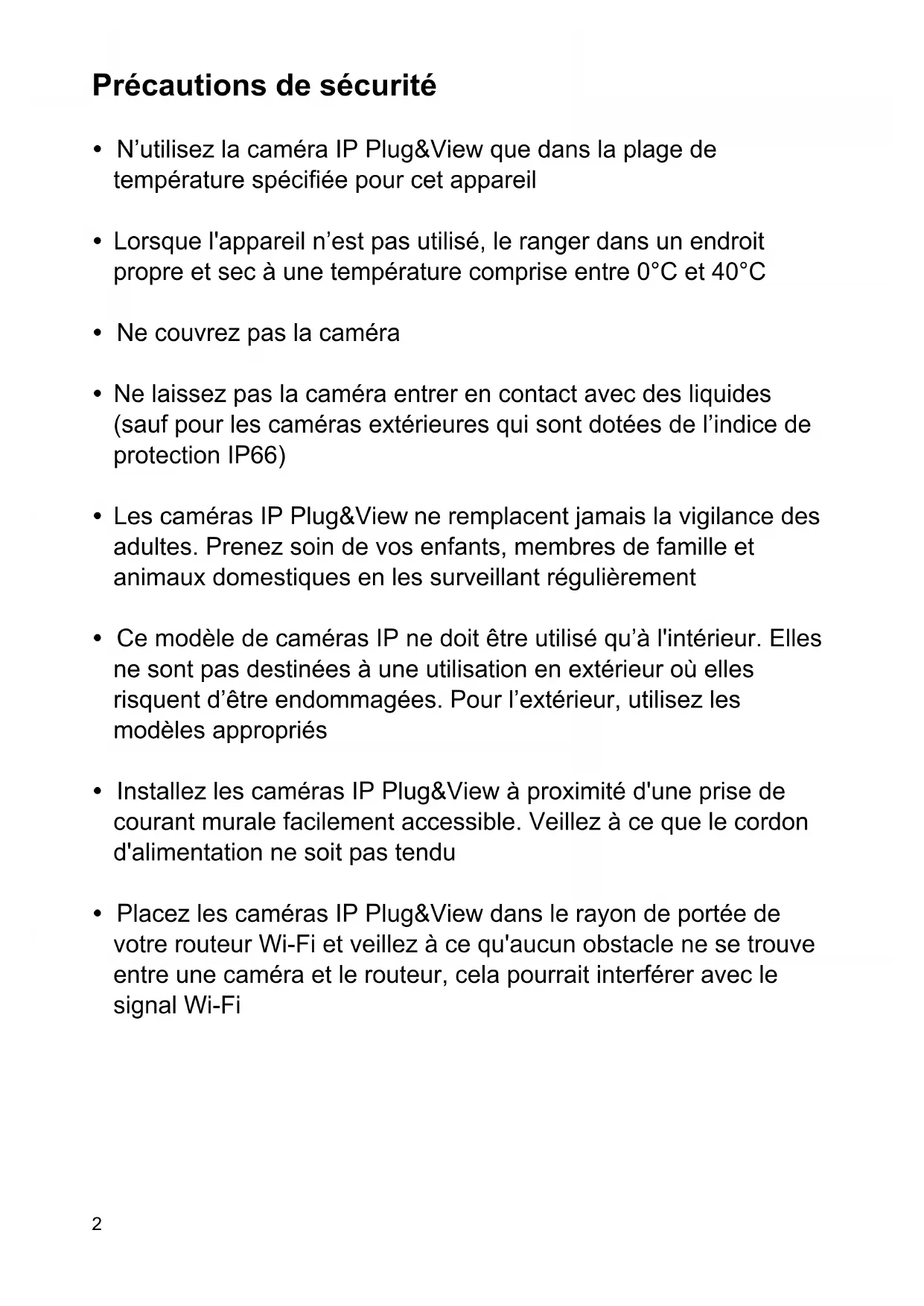 se trouvant à http://plug-view.com/privacy-policy-for-platform-apps/. Il faut choisir un mot de passe fort pour protéger votre compte Plug&View de tout accès non autorisé. Il doit contenir au moins 8 caractères ; des caractères majuscules et minuscules, et des chiffres. En plus, il faut changer régulièrement le mot de passe de la caméra afin d'éviter tout accès non autorisé, ici. La diffusion en continu en direct, les notifications poussées et d'autres services se font via un serveur cloud. Malgré les solutions de sauvegarde, la stabilité du système et la gestion de la bande passante, la disponibilité continue du système ne peut être garantie. Contenu du coffret 1 x caméra IP Plug&View 1x adaptateur d'alimentation avec câble 1x guide d'installation rapide 1x CD d'utilitaires En option : 1 x câble Ethernet 1 x support de montage au plafond/mural 1 x antenne amovible
