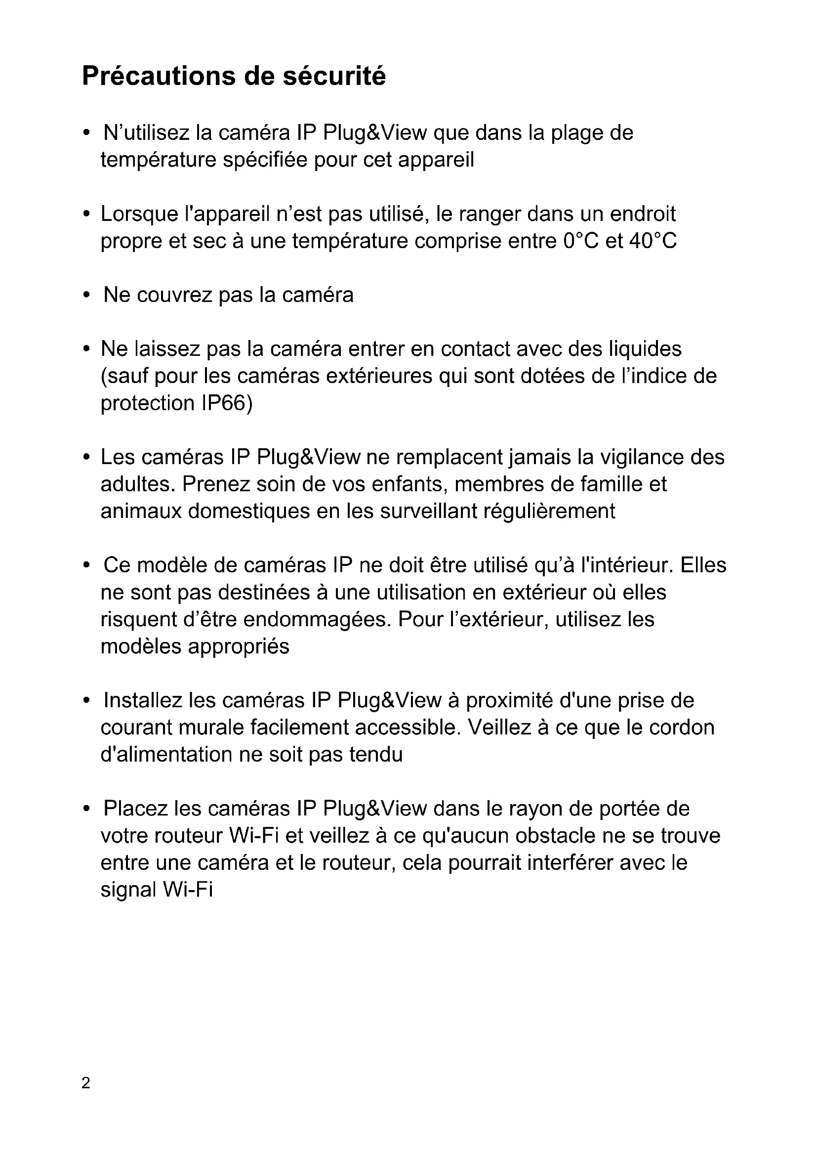 se trouvant à http://plug-view.com/privacy-policy-for-platform-apps/. Il faut choisir un mot de passe fort pour protéger votre compte Plug&View de tout accès non autorisé. Il doit contenir au moins 8 caractères ; des caractères majuscules et minuscules, et des chiffres. En plus, il faut changer régulièrement le mot de passe de la caméra afin d'éviter tout accès non autorisé, ici. La diffusion en continu en direct, les notifications poussées et d'autres services se font via un serveur cloud. Malgré les solutions de sauvegarde, la stabilité du système et la gestion de la bande passante, la disponibilité continue du système ne peut être garantie. Contenu du coffret 1 x caméra IP Plug&View 1x adaptateur d'alimentation avec câble 1x guide d'installation rapide 1x CD d'utilitaires En option : 1 x câble Ethernet 1 x support de montage au plafond/mural 1 x antenne amovible