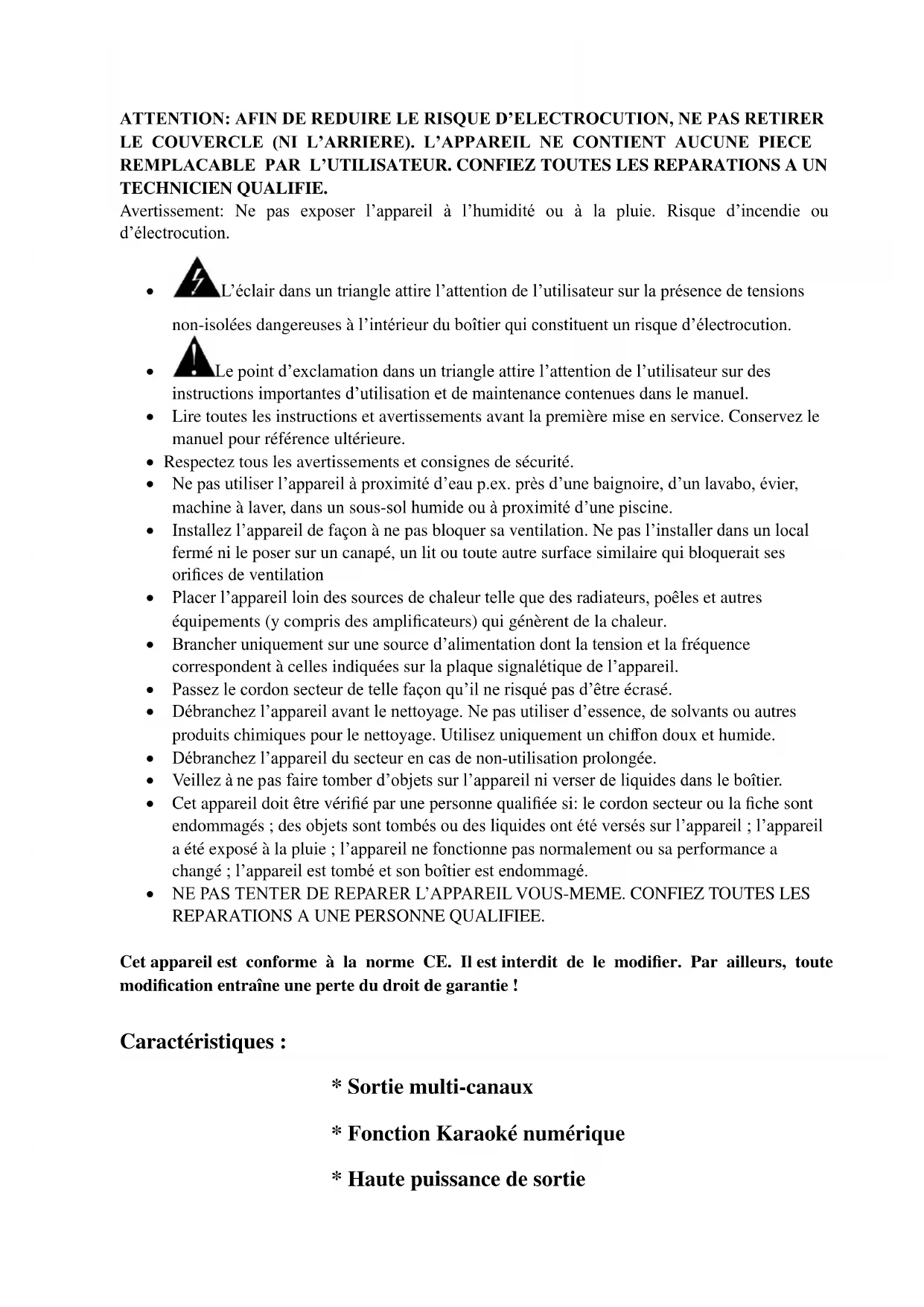 - NE PAS TENTER DE REPARER L’APPAREIL VOUS-MEME. CONFIEZ TOUTES LES REPARATIONS A UNE PERSONNE QUALIFIEE. Cet appareil est conforme à la norme CE. Il est interdit de le modifier. Par ailleurs, toute modification entraîne une perte du droit de garantie ! Caractéristiques :