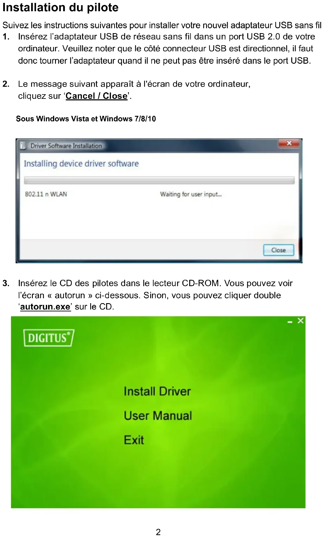 Guide d'installation rapide DN-70542 Rev.2 • DN-70543 Rev.22 Installation du pilote Suivez les instructions suivantes pour installer votre nouvel adaptateur USB sans fil :