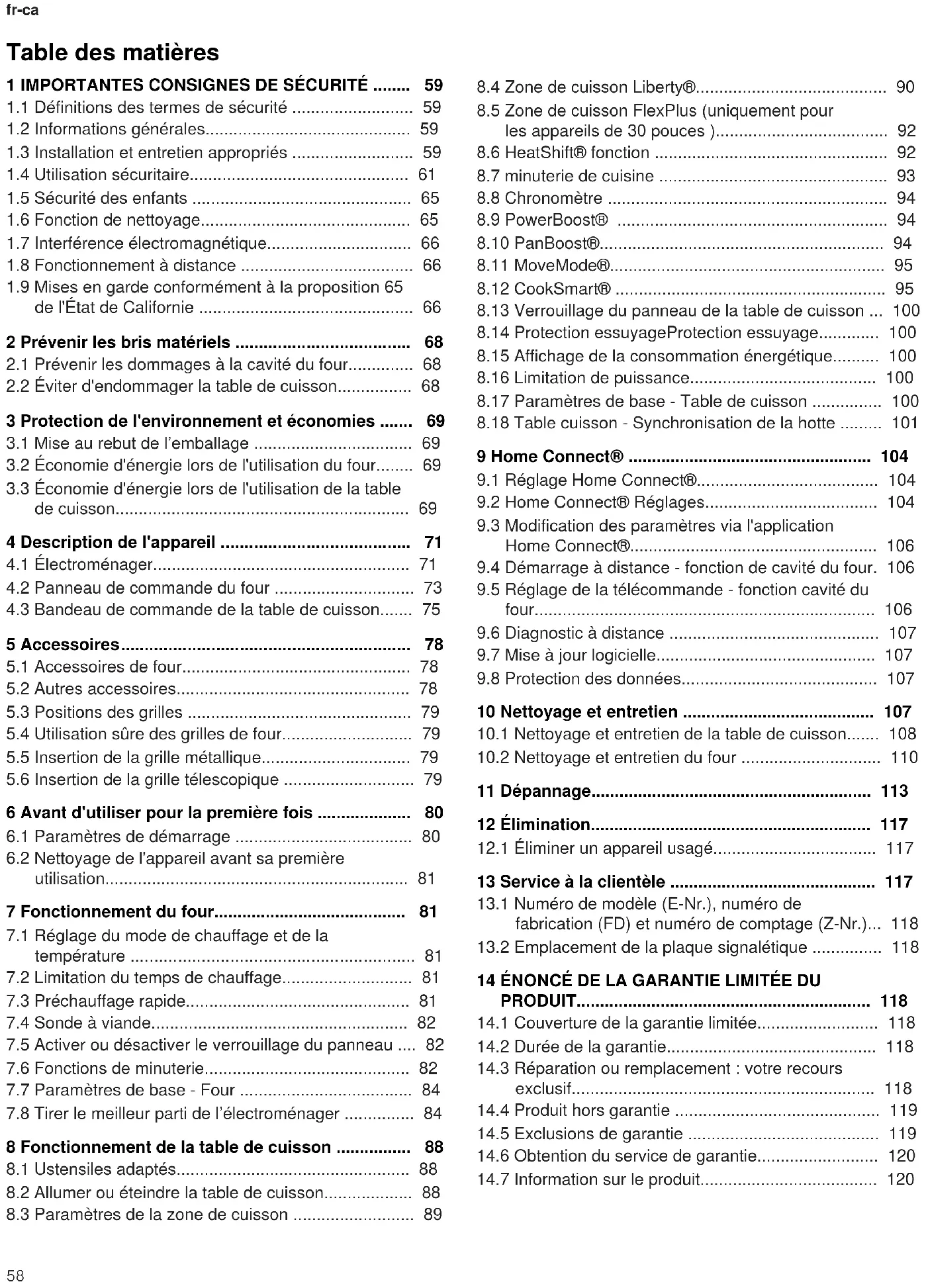 LIRE ET CONSERVER CES INSTRUCTIONSfr-ca Prévenir les bris matériels Prévenir les bris matériels 2 Prévenir les bris matériels Prévenir les bris matériels 2.1 Prévenir les dommages à la cavité du four AVIS : La présence d'objets sur le fond de la cavité du four provoquera une accumulation de chaleur. Les temps de cuisson et de rôtissage ne seront alors plus exacts et cela risque d'endommager l'émail. ▶ Ne couvrez pas le fond de la cavité du four avec du papier d'aluminium ou du papier sulfurisé. ▶ Ne placez pas d'accessoires sur le fond de la cavité du four. Ne laissez pas le papier d'aluminium dans la cavité du four entrer en contact avec la vitre de la porte, cela pourrait provoquer une décoloration permanente. Ne versez jamais d'eau dans la cavité du four lorsqu'elle est encore chaude. Ne placez jamais d'ustensiles de cuisine contenant de l'eau sur le fond de la cavité du four. La présence prolongée d'humidité dans la cavité du four entraîne une corrosion. ▶ Laissez la cavité du four sécher après usage.▶ Ne gardez pas les aliments humides dans la cavité du four pendant une longue période avec la porte fermée. ▶ Ne conservez pas d’aliments dans la cavité du four. Laisser l'appareil refroidir avec la porte ouverte endommagera le devant des éléments de cuisine voisins au fil du temps. ▶ Laissez toujours la cavité du four refroidir avec la porte fermée après la cuisson à des températures élevées. Ne laissez la cavité du four sécher avec la porte ouverte que si beaucoup d'humidité a été produite pendant le fonctionnement. Le jus de fruit qui s'égoutte d'un moule laisse des taches qui ne peuvent pas s'enlever. ▶ Lors de la cuisson de tartes aux fruits très juteuses, n'en mettez pas trop sur la plaque à pâtisserie. Si le joint est très sale, la porte de l'appareil ne se fermera pas correctement lorsque l'appareil est en marche. Cela pourrait endommager l'avant des unités de cuisine adjacentes. ▶ Ne faites pas fonctionner l'appareil si le joint est endommagé ou manquant.Ne faites pas fonctionner l'appareil si le joint est endommagé ou manquant. S'asseoir ou placer des objets sur la porte de l'appareil peut l'endommager. ▶ Ne placez pas et ne suspendez pas d'objets sur la porte de l'appareil. ▶ Ne placez pas d'ustensiles de cuisine ou d'accessoires sur la porte de l'appareil. Avec certains modèles, les accessoires peuvent rayer la vitre de la porte lors de la fermeture de la porte de l'appareil. ▶ Poussez toujours complètement les accessoires dans la cavité du four. Le transport de l'appareil par la poignée de porte pourrait le casser. La poignée de porte ne peut pas supporter le poids de l'appareil. ▶ Ne pas porter ou tenir l'appareil par la porte. 2.2 Éviter d'endommager la table de cuisson AVIS : Les plats de cuisson dont le dessous est rugueux peuvent rayer la surface en vitrocéramique. ▶ Vérifiez le fond de l'ustensile avant de le poser. Du sel, du sucre ou des grains de sable rayent la surface de la vitrocéramique. ▶ Ne jamais utiliser la table de cuisson comme surface de travail ou pour y déposer des objets. La surchauffe peut endommager la batterie de cuisine. ▶ Ne chauffez pas de casseroles ou poêles vides. Les ustensiles de cuisson chauds peuvent provoquer une surchauffe des composants électroniques. ▶ Ne posez jamais de poêles et de casseroles chaudes sur le panneau de commande ou le cadre de la table de cuisson. Lorsque des objets durs ou pointus tombent sur la table de cuisson, ils peuvent l'endommager. ▶ Ne laissez pas d'objets durs ou pointus tomber sur la table de cuisson. Le papier d'aluminium et le plastique fondent sur les zones de cuisson chaudes. ▶ Ne laissez pas de papier d'aluminium ou de plastique entrer en contact avec les zones de cuisson chaudes. ▶ N'utilisez pas de film protecteur pour table de cuisson. Des agents de nettoyage inappropriés peuvent provoquer des décolorations métalliques chatoyantes sur la surface vitrocéramique. ▶ Reportez-vous aux recommandations de nettoyage de ce manuel. Vue d'ensemble des types de dommages les plus courants Vous trouverez ici un aperçu des types de dommages les plus courants et des suggestions pour les éviter. Taches Cause Comment éviter Éclaboussure de nourriture Retirez immédiatement les éclaboussures de nourriture à l'aide d'un grattoir à verre. Produits de nettoyage inappropriés Utilisez des agents de nettoyage adaptés aux tables de cuisson en vitrocéramique. Rayures Cause Comment éviter Sel, sucre et sable N'utilisez pas la table de cuisson comme surface de travail ou espace de rangement.Protection de l'environnement et économies fr-ca