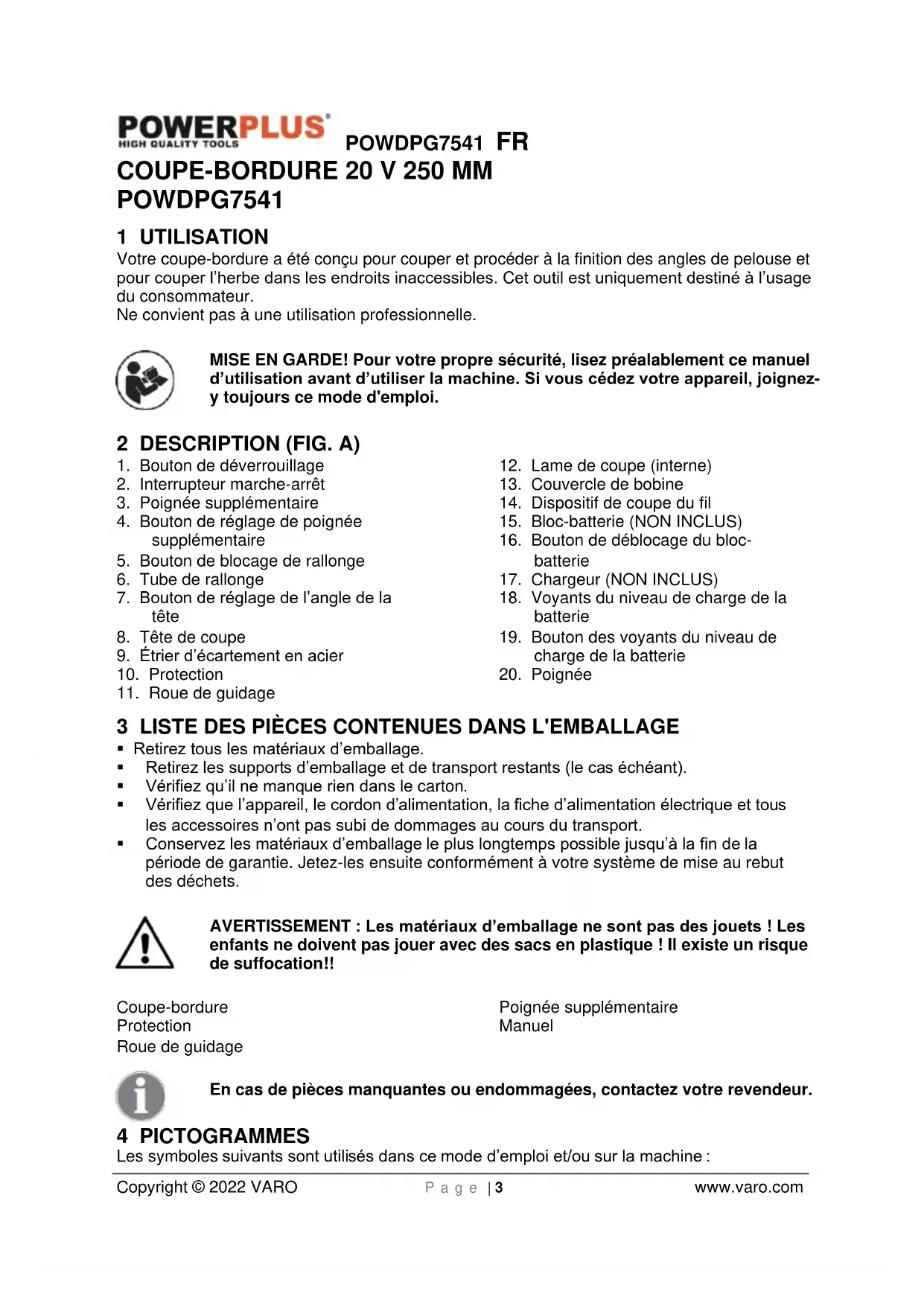 enfants ne doivent pas jouer avec des sacs en plastique ! Il existe un risque de suffocation!! Coupe-bordure Protection Roue de guidage Poignée supplémentaire Manuel En cas de pièces manquantes ou endommagées, contactez votre revendeur. 4 PICTOGRAMMES Les symboles suivants sont utilisés dans ce mode d’emploi et/ou sur la machine :POWDPG7541 FR Copyright © 2022 VARO P a g e | 4 www.varo.com