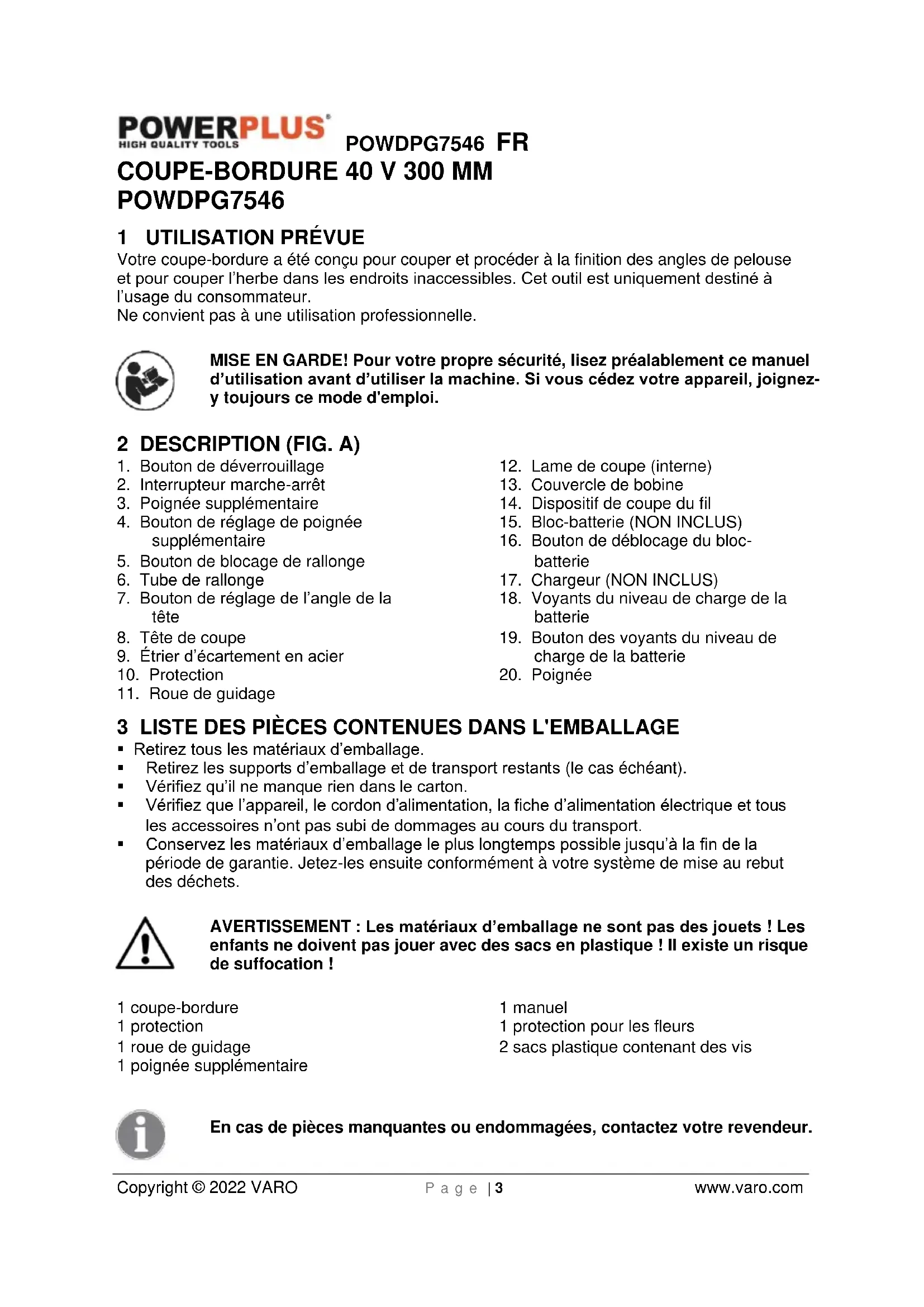 VARO – Vic. Van Rompuy N.V. - Joseph Van Instraat 9 - BE2500 Lier - BELGIQUE, déclare que: appareil : COUPE BORDURE 20 V - Fonctionnant sur batterie marque: PowerPlus modèle: POWDPG7546 est en conformité avec les exigences essentielles et les autres dispositions pertinentes des Directives européennes applicables, basées sur l'application des normes européennes harmonisées. Toute modification non autorisée de l'appareil annule cette déclaration. Directives européennes (y compris, le cas échéant, leurs amendements à la date de la signature) : 2011/65/EU 2006/42/EC 2014/30/EU 2000/14/EC Annex VI LwA Measured 90 dB(A) Guaranteed 92 dB(A) Notified Body TÜV SÜD Normes européennes harmonisées (y compris, le cas échéant, leurs amendements à la date de la signature) : EN60335-1 : 2012 EN50636-2-91 : 2014 EN55014-1 : 2017 EN55014-2 : 2015 Détenteur de la Documentation technique : Philippe Vankerkhove, VARO – Vic. Van Rompuy N.V. Le soussigné agit au nom du PDG de l'entreprise, Ludo Mertens Réglementation – Directeur de la conformité 05/01/2022, Lier - BelgiumPOWDPG7546 EN Copyright © 2022 VARO P a g e | 1 www.varo.com 1 INTENDED USE ............................................................................... 3
