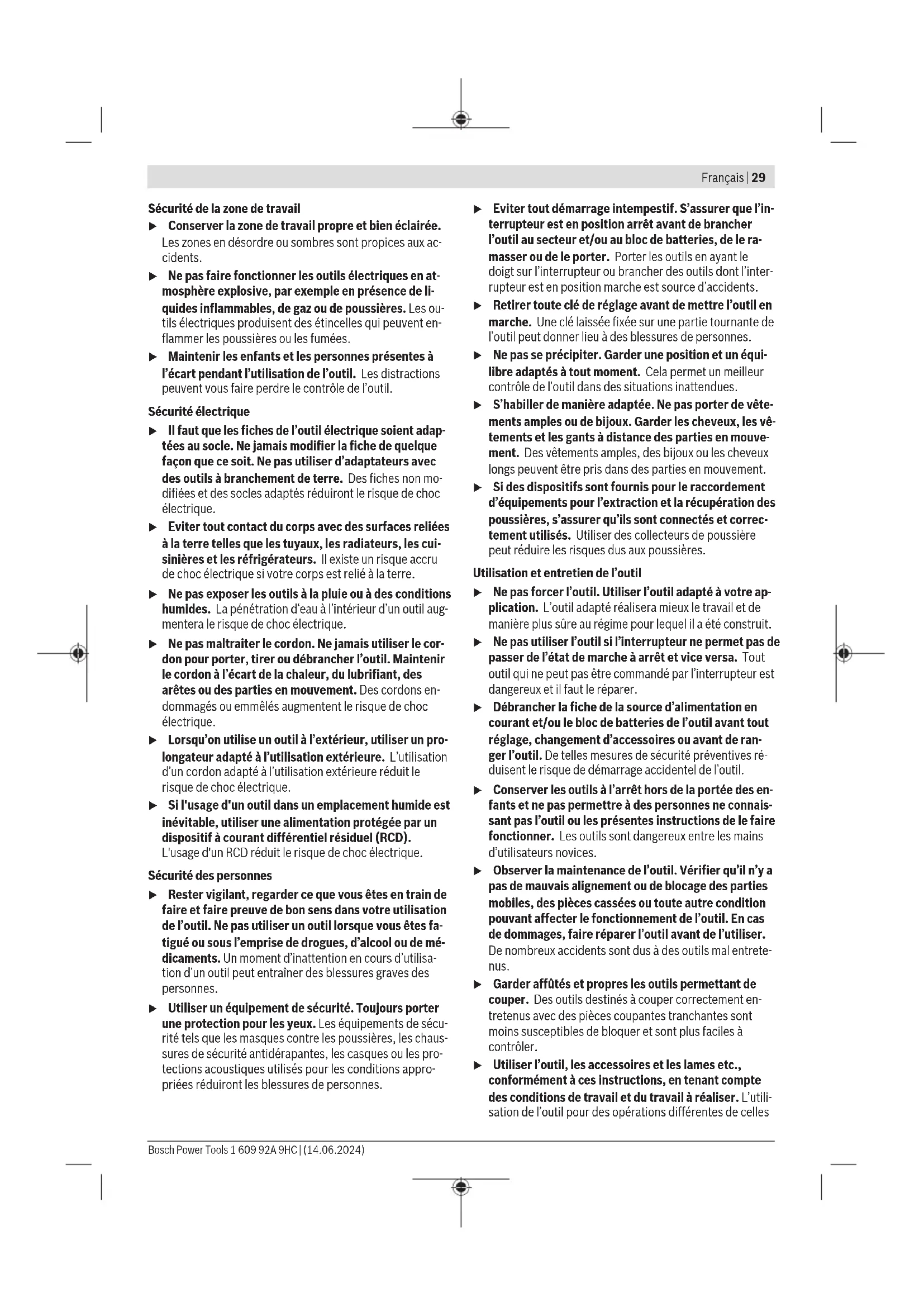 for your application. Substrate too hard For concrete with hard inclusions, try fastening at a different point. Otherwise, use alternative fastening methods, e.g. dowels. Nail does not grip in steel. Steel substrate too thin Use alternative fastening methods, e.g. screwdriving. Nail does not come out of con- tact element or contact ele- ment remains in pressed-in position. Jamming in the contact ele- ment (e.g. due to foreign ob- jects or dirt) Clear the jam(see "Clearing Jams/Resetting", page25). Bosch Power Tools 1 609 92A 9HC | (14.06.2024)28 | Français Problem Cause Corrective measure Error rate too high Substrate too hard Use alternative fastening methods, e.g. dowels. Firing pin worn Have power tool repaired by an authorised after-sales service centre for Bosch power tools. Nails do not slide into the magazine. Magazine dirty Clean the magazine(12), e.g. with a paintbrush. After-Sales Service and Application Service Our after-sales service responds to your questions concern- ing maintenance and repair of your product as well as spare parts. You can find explosion drawings and information on spare parts at: www.bosch-pt.com The Bosch product use advice team will be happy to help you with any questions about our products and their accessor- ies. In all correspondence and spare parts orders, please always include the 10‑digit article number given on the nameplate of the product. Great Britain Robert Bosch Ltd. (B.S.C.) P.O. Box 98 Broadwater Park North Orbital Road Denham Uxbridge UB 9 5HJ At www.bosch-pt.co.uk you can order spare parts or arrange the collection of a product in need of servicing or repair. Tel. Service: (0344) 7360109 E-Mail: boschservicecentre@bosch.com You can find further service addresses at: www.bosch-pt.com/serviceaddresses Transport The recommended lithium-ion batteries are subject to legis- lation on the transport of dangerous goods. The user can transport the batteries by road without further require- ments. When the batteries are shipped by third parties (e.g. air transport or forwarding agency), special requirements on packaging and labelling (e.g. ADR regulations) must be met. A dangerous goods expert must be consulted when prepar- ing the items for shipping. Dispatch battery packs only when the housing is undam- aged. Tape or mask off open contacts and pack up the bat- tery in such a manner that it cannot move around in the packaging. Please also observe the possibility of more de- tailed national regulations. Disposal Power tools, rechargeable batteries, accessor- ies and packaging should be sorted for environ- mental-friendly recycling. Do not dispose of power tools and batteries/re- chargeable batteries into household waste! Only for EU countries: Power tools that are no longer suitable for use and defective or used batteries must be disposed of separately. Use the designated collection systems. If disposed incorrectly, waste electrical and electronic equipment may have harmful effects on the environment and human health, due to the potential presence of hazardous substances. Only for United Kingdom: According to The Waste Electrical and Electronic Equipment Regulations 2013 (SI2013/3113) (as amended) and the Waste Batteries and Accumulators Regulations 2009 (SI2009/890) (as amended), products that are no longer usable must be collected separately and disposed of in an environmentally friendly manner. Battery packs/batteries: Li-ion: Please observe the notes in the section on transport (see "Transport", page28). Français Consignes de sécurité Avertissements de sécurité généraux pour l’outil AVERTISSE- MENT Lire tous les avertissements de sé- curité et toutes les instructions. Ne pas suivre les avertissements et instructions peut donner lieu à un choc électrique, un incen- die et/ou une blessure sérieuse. Conserver tous les avertissements et toutes les instruc- tions pour pouvoir s'y reporter ultérieurement. Le terme «outil» dans les avertissements fait référence à votre outil électrique alimenté par le secteur (avec cordon d’alimentation) ou votre outil fonctionnant sur batterie (sans cordon d’alimentation). 1 609 92A 9HC | (14.06.2024) Bosch Power ToolsFrançais | 29 Sécurité de la zone de travail u Conserver la zone de travail propre et bien éclairée. Les zones en désordre ou sombres sont propices aux ac- cidents. u Ne pas faire fonctionner les outils électriques en at- mosphère explosive, par exemple en présence de li- quides inflammables, de gaz ou de poussières. Les ou- tils électriques produisent des étincelles qui peuvent en- flammer les poussières ou les fumées. u Maintenir les enfants et les personnes présentes à l’écart pendant l’utilisation de l’outil. Les distractions peuvent vous faire perdre le contrôle de l’outil. Sécurité électrique u Il faut que les fiches de l’outil électrique soient adap- tées au socle. Ne jamais modifier la fiche de quelque façon que ce soit. Ne pas utiliser d’adaptateurs avec des outils à branchement de terre. Des fiches non mo- difiées et des socles adaptés réduiront le risque de choc électrique. u Eviter tout contact du corps avec des surfaces reliées à la terre telles que les tuyaux, les radiateurs, les cui- sinières et les réfrigérateurs. Il existe un risque accru de choc électrique si votre corps est relié à la terre. u Ne pas exposer les outils à la pluie ou à des conditions humides. La pénétration d‘eau à l’intérieur d’un outil aug- mentera le risque de choc électrique. u Ne pas maltraiter le cordon. Ne jamais utiliser le cor- don pour porter, tirer ou débrancher l’outil. Maintenir le cordon à l’écart de la chaleur, du lubrifiant, des arêtes ou des parties en mouvement. Des cordons en- dommagés ou emmêlés augmentent le risque de choc électrique. u Lorsqu’on utilise un outil à l’extérieur, utiliser un pro- longateur adapté à l’utilisation extérieure. L’utilisation d’un cordon adapté à l’uti