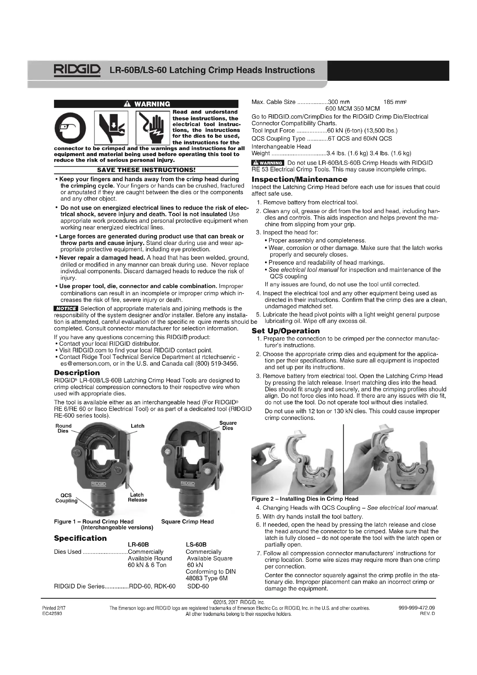 structions, normal practice and applicable codes. Notice d’emploi pour têtes de sertissage à loquet type LR-60B et LS-60B AVERTISSEMENT Avant d’utiliser cetoutil, et afin de limiterles risques d’accidentgrave, familiarisez-vousavec le mode d’emploide la pince électrique,celui des matrices utilisées, la notice visant les manchons sertis,ainsi que les avertissements et consignes d’utilisation de l’ensem-ble du matériel et des raccords utilisés. CONSERVEZ CETTE NOTICE !