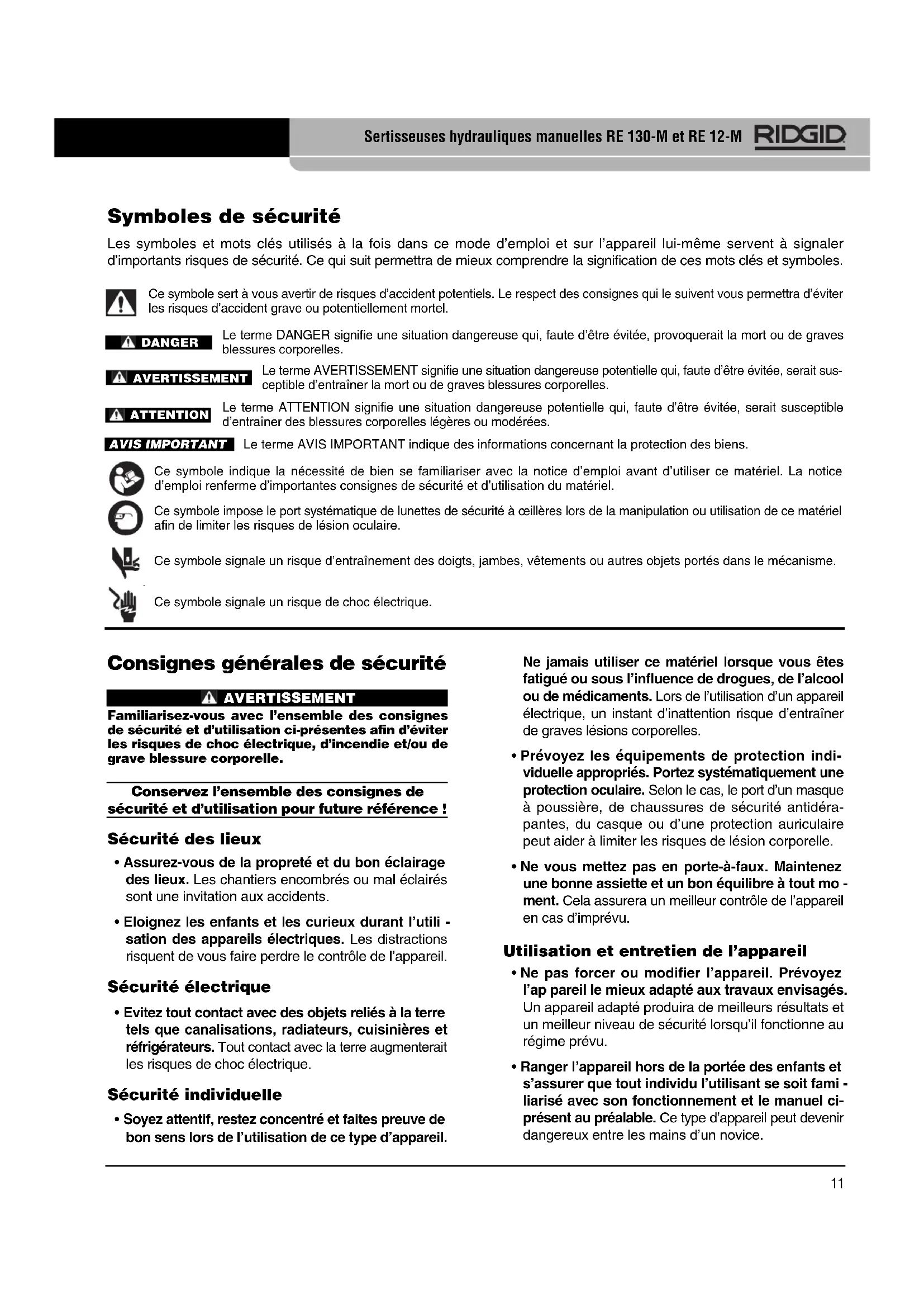 - Ranger l’appareil hors de la portée des enfants et s’assurer que tout individu l’utilisant se soit fami - liarisé avec son fonctionnement et le manuel ci- présent au préalable. Ce type d’appareil peut deve nir dangereux entre les mains d’un novice. Symboles de sécurité Les symboles et mots clés utilisés à la fois dans ce mode d’emploi et sur l’appareil lui-même servent à signaler d’importants risques de sécurité. Ce qui suit permettra de mieux comprendre la signification de ces mots clés et symboles. Ce symbole sert à vous avertir de risques d’accident potentiels. Le respect des consignes qui le suivent vous permettra d’éviter les risques d’accident grave ou potentiellement mortel. Le terme DANGER signifie une situation dangereuse qui, faute d’être évitée, provoquerait la mort ou de graves blessures corporelles. Le terme AVERTISSEMENT signifie une situation dangereuse potentielle qui, faute d’être évitée, serait sus- ceptible d’entraîner la mort ou de graves blessures corporelles. Le terme ATTENTION signifie une situation dangereuse potentielle qui, faute d’être évitée, serait susceptible d’entraîner des blessures corporelles légères ou modérées. Le terme AVIS IMPORTANT indique des informations concernant la protection des biens. Ce symbole indique la nécessité de bien se familiariser avec la notice d’emploi avant d’utiliser ce matériel. La notice d’emploi renferme d’importantes consignes de sécurité et d’utilisation du matériel. Ce symbole impose le port systématique de lunettes de sécurité à œillères lors de la manipulation ou utilisation de ce matériel afin de limiter les risques de lésion oculaire. Ce symbole signale un risque d’entraînement des doigts, jambes, vêtements ou autres objets portés dans le mécanisme. Ce symbole signale un risque de choc électrique. AVIS IMPORTANTDANGERAVERTISSEMENTATTENTION Sertisseuses hydrauliques manuelles RE 130-M et RE 12-M 11Sertisseuses hydrauliques manuelles RE 130-M et RE 12-M
