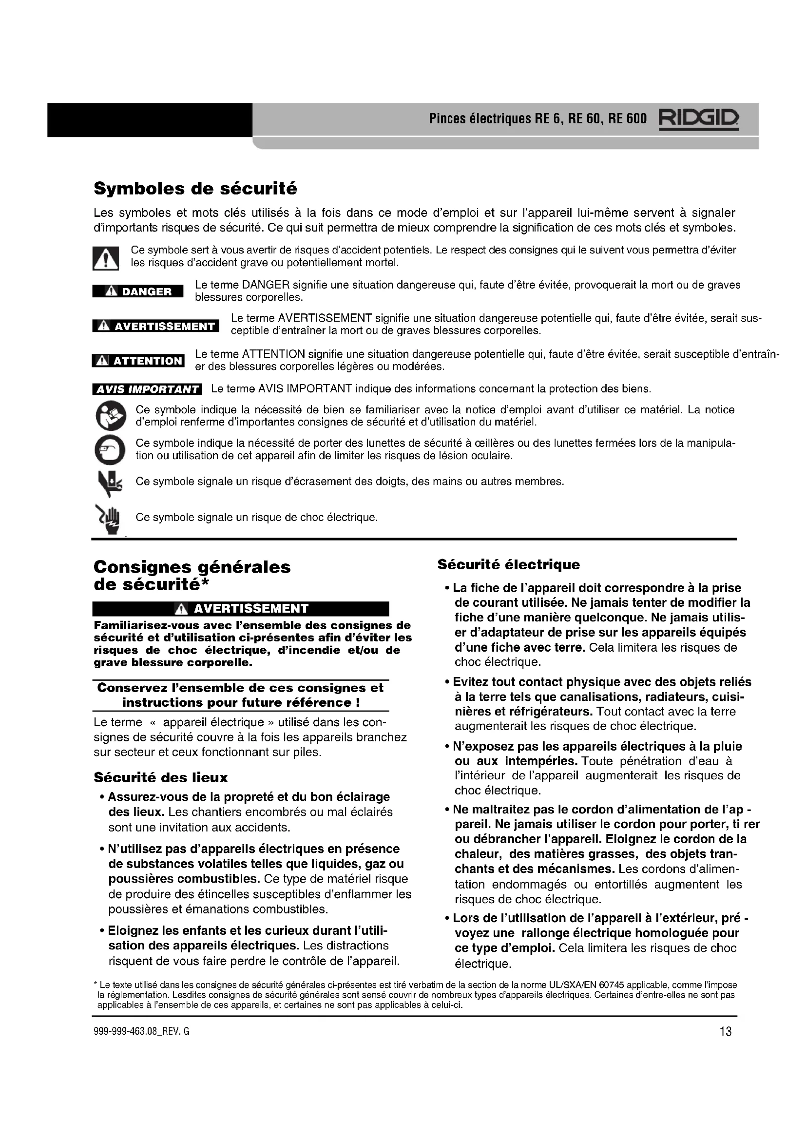 - Ne jamais tenter de réparer un bloc-piles endom- magé. La révision des bloc-piles doit être confiée au fabricant ou à son représentant agréé. Consignes de sécurité spécifiques AVERTISSEMENT La section suivante contient d’importantes con- signes de sécurité visant ce type d’appareil en par- ticulier. Lisez-les soigneusement avant d’utiliser la pince électrique afin de limiter les risques de choc élec- trique et de graves blessures corporelles.– Les consignes d’utilisation de tout autre matériel utilisé avec cet appareil. Le non-respect de l’ensemble de ces consignes pour- rait entraîner d’importants dégâts matériels et/ou de graves lésions corporelles. Coordonnées RIDGID En cas de questions concernant ce produit RIDGID