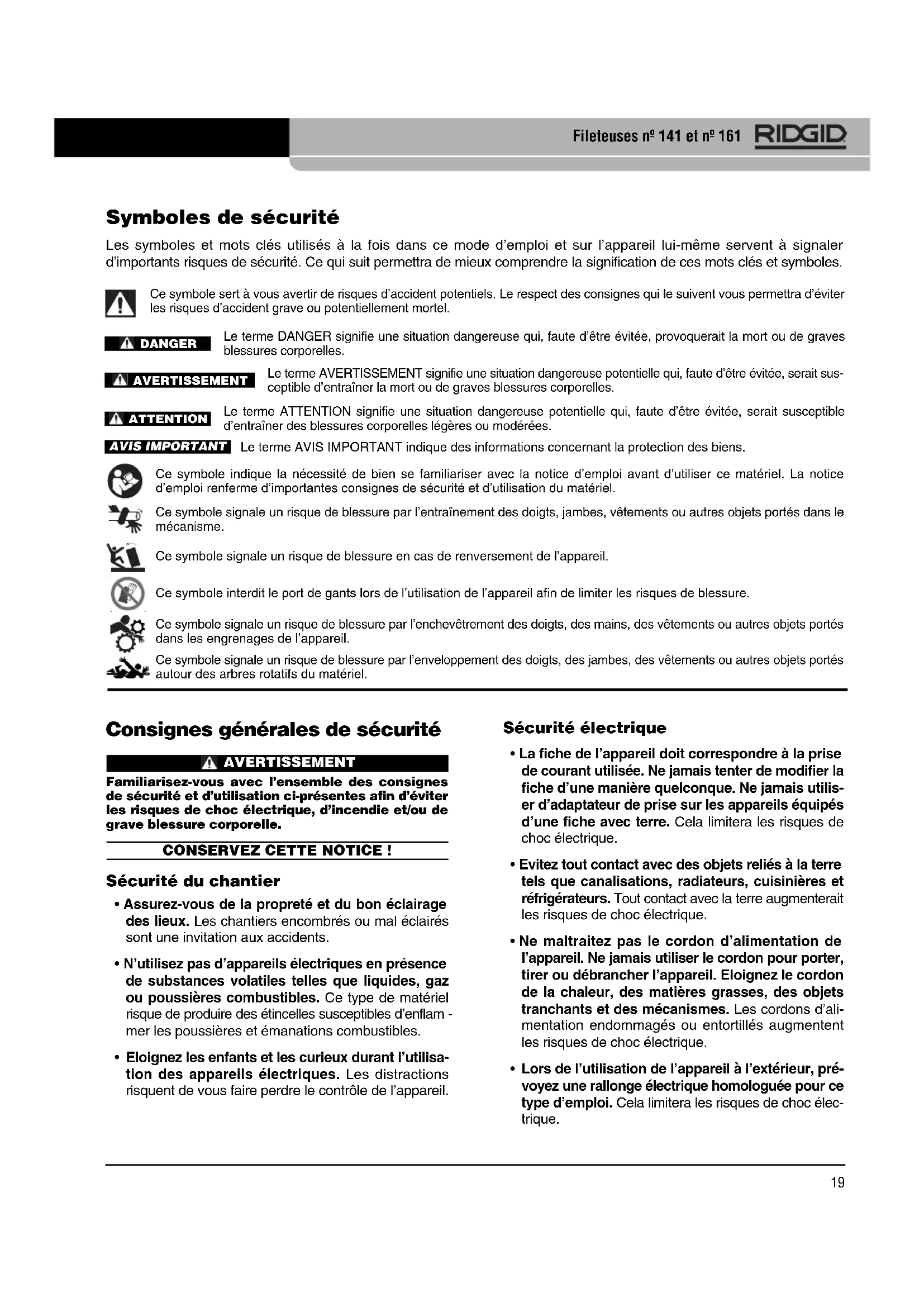 Fileteuses nº 141 et nº 16119 Fileteuses nº 141 et nº 161 Consignes générales de sécurité AVERTISSEMENT Familiarisez-vous avec l’ensemble des consignes de sécurité et d’utilisation ci-présentes afin d’éviter les risques de choc électrique, d’incendie et/ou de grave blessure corporelle. CONSERVEZ CETTE NOTICE ! Sécurité du chantier