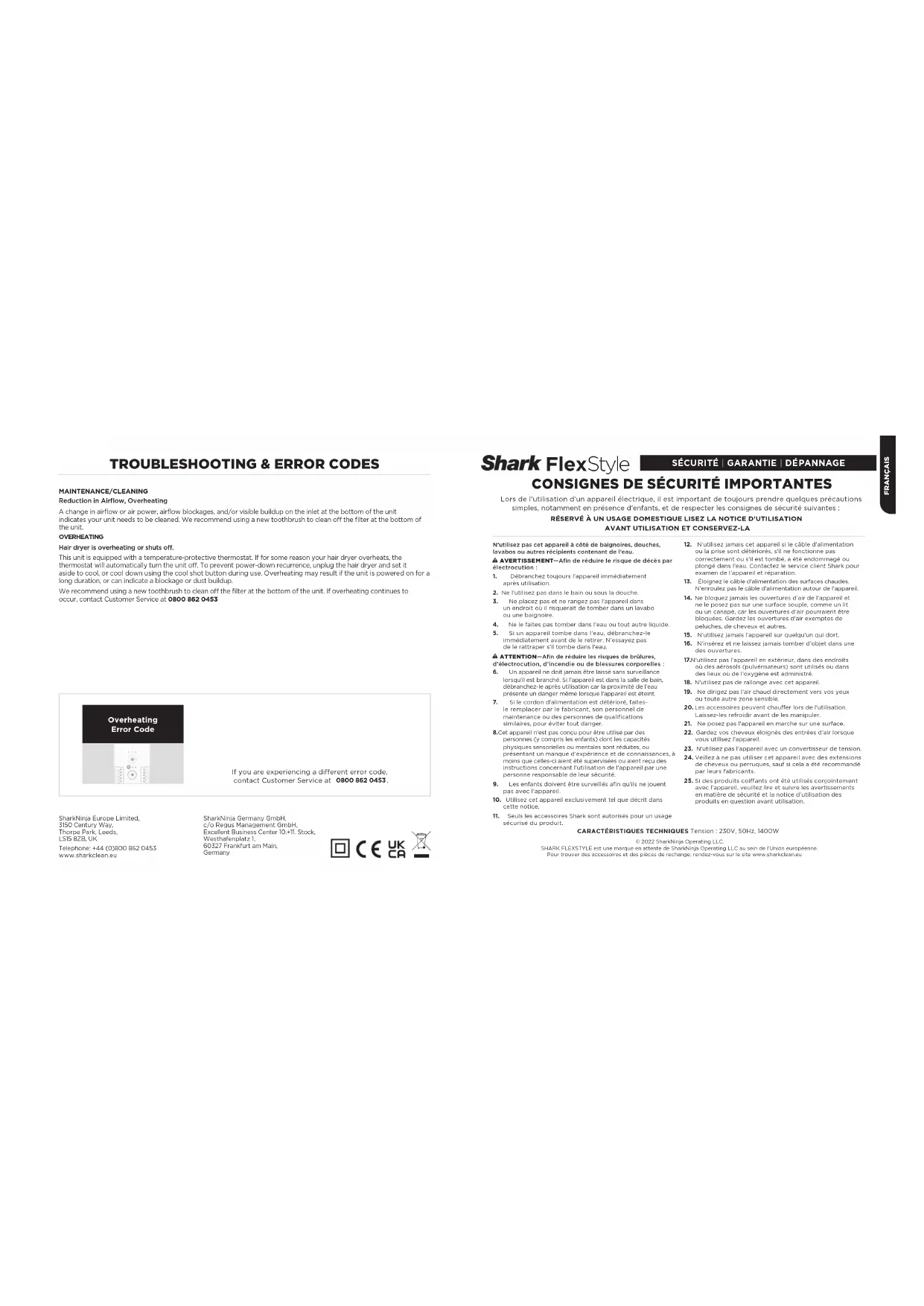 avec l’appareil, veuillez lire et suivre les avertissements en matière de sécurité et la notice d’utilisation des produits en question avant utilisation.CARACTÉRISTIQUES TECHNIQUES Tension: 230V, 50Hz, 1400W ©2022 SharkNinja Operating LLC.SHARK FLEXSTYLE est une marque en attente de SharkNinja Operating LLC au sein de l’Union européenne.Pour trouver des accessoires et des pièces de rechange, rendez-vous sur le site www.sharkclean.euFRANÇAISLorsqu’un client achète un produit en Europe, il bénéficie des droits légaux relatifs à la qualité du produit vos « droits légaux » : garantie légale de conformité de 2 ans à compter de la délivrance et garantie légale des vices cachés de 2 ans à compter de la découverte du vice. Le client peut faire valoir ces droits à l’encontre de son détaillant. Shark a une grande confiance dans la qualité de ses produits et fournit donc une garantie commerciale supplémentaire gratuite pouvant aller jusqu’à deux ans. Ces conditions contractuelles se réfèrent uniquement à la garantie commerciale et ne portent aucune atteinte à vos droits légaux. Veuillez noter que la garantie commerciale de deux ans est disponible dans toute l’UE. Nos conditions de garantie commerciale sont les suivantes. Elles n’aectent en rien vos droits légaux ni les obligations de votre revendeur à votre égard. Garantie commerciale Shark® Votre appareil Shark constitue un investissement important. Votre nouvel appareil doit donc fonctionner correctement le plus longtemps possible. La garantie commerciale fournie avec l’appareil reflète la confiance du fabricant dans ses produits et témoigne de leur qualité de fabrication. Chaque produit Shark® bénéficie de garanties légales (conformité et vices cachés). Notre service client (+33 (800) 908874) est ouvert du lundi au vendredi de 8h à 20h, le samedi de 9h à 19h et le dimanche de 10h à 18h30. L’appel est gratuit et vous serez directement mis en relation avec un représentant Shark. Vous trouverez également une assistance en ligne sur le site sharkclean.eu Comment puis-je enregistrer ma garantie commerciale Shark ? Vous pouvez enregistrer votre garantie commerciale en ligne dans un délai de 28 jours après la date d’achat de votre produit. Pour gagner du temps, préparez les informations suivantes à propos de votre appareil :