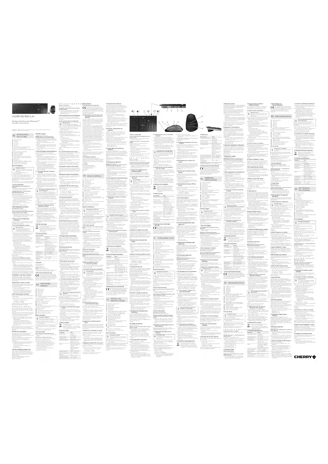 ⑰ Touche pour la connexion Bluetooth⑱ Récepteur pour la connexion radio Avant de commencer ... CHERRY DW 9500 SLIM est une combinaison de clavier et de souris sans fil pour l’utilisation des PC / ordinateurs portables.Pour obtenir des informations sur d'autres produits, sur les téléchargements et bien d'autres choses, consultez le site www.cherry.de. 1 Pour votre sécurité Risque d’étouffement en cas d’ingestion de petites pièces• Conserver l’appareil hors de portée des enfantsde moins de 3 ans.LMR signifie "Lésion due aux mouvements répétitifs"Le syndrome LMR apparaît suite à de petits mouv ements se répétant en permanence.• Organisez votre poste de travail de manière ergonomique.• Positionnez le clavier et la souris de telle façonque vos bras et vos poignets se trouvent latéralement par rapport au corps et soient étendus.• Modifiez l’inclinaison du clavier en montant la barr e de support.• Faites plusieurs petites pauses, le cas échéant accompagnées d’exercices d’étirement.• Modifiez souvent votre attitude corporelle. 2 Éviter les dommages Endommagement du clavier• Ne retirez pas les cabochons de touche.Effacement des supports de données et end ommagement des montres mécaniques par des aimants• Ne placez pas les supports de données (cartes magnétiques, disques durs externes, etc.) ou les montres mécaniques à moins de 10 cm de la souris ou de la barre de support du clavier. 3 Relier les appareils au PC / à l’ordinateur portable Vous pouvez relier les appareils au PC / à l’ordinateur portable par Bluetooth ou avec le récepteur via la connexion radio 2,4 GHz.