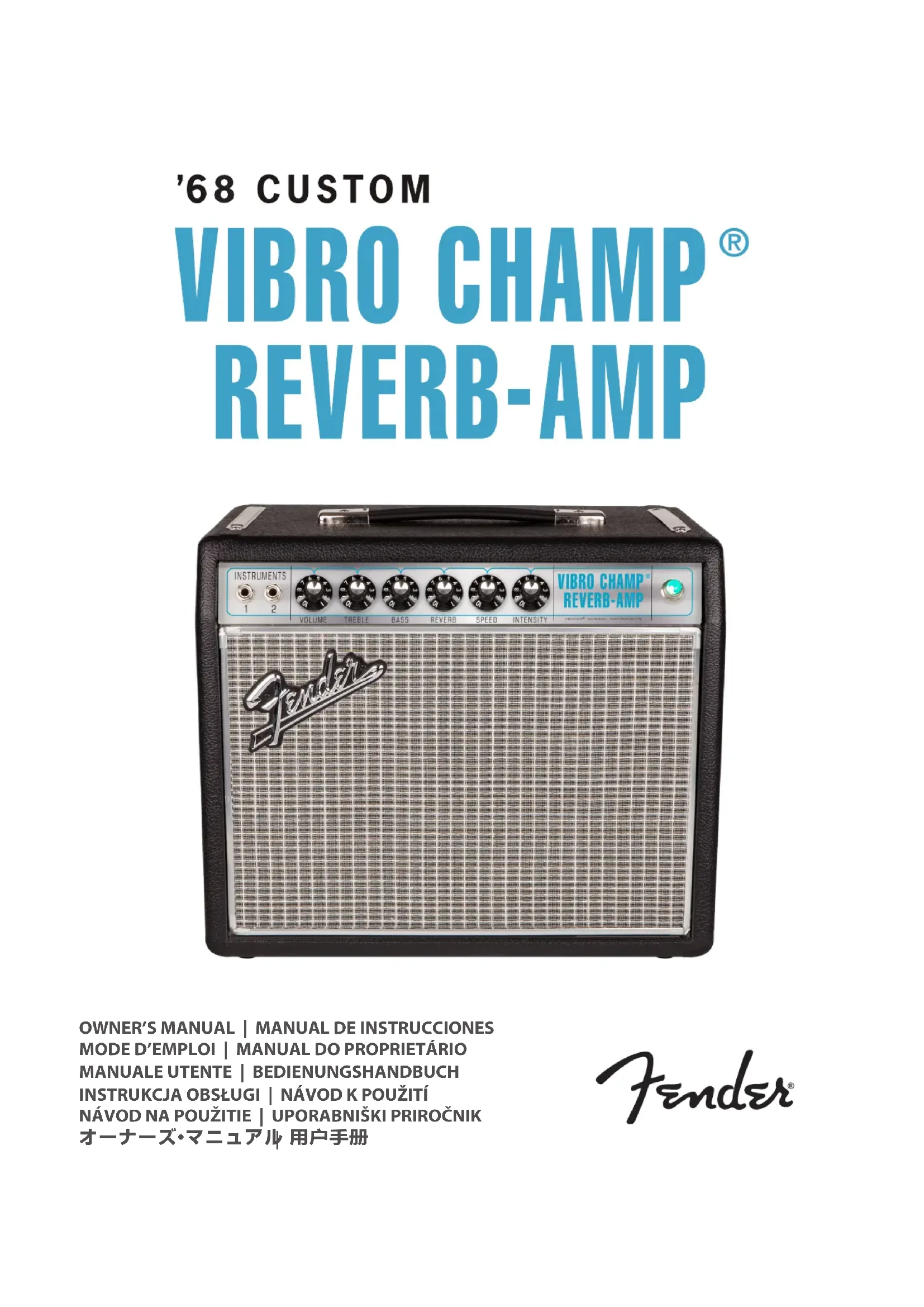 FRANÇAIS La série des amplis ‘68 Custom est devenue une gamme extrêmement populaire parmi les guitaristes qui aiment le son classique des amplis Fender associé à des réglages de tonalité qui trouvent un écho chez les musiciens d’aujourd’hui. Avec seulement 5 W, le Vibro Champ original était célèbre pour le classique trémolo Fender, le brillant de ces lampes et le « killer grind » à un niveau raisonnable. La ‘68 Custom Vibro Champ améliore cet ampli classique en y ajoutant une réverbération numérique salle et en utilisant un plus grand haut-parleur de 10” pour augmenter le rendu du bas de gamme. Ces modications rendent cette petite merveille idéale pour les répétitions, l’enregistrement à domicile et même les petits concerts.