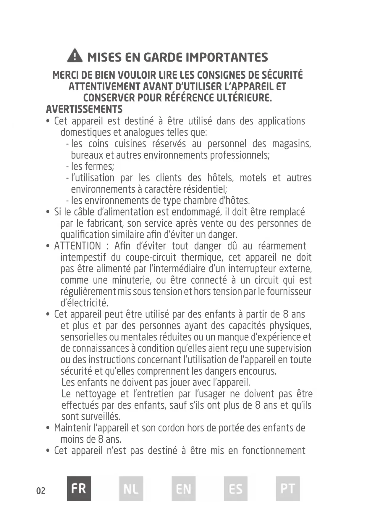 - ATTENTION : Afin d’éviter tout danger dû au réarmement intempestif du coupe-circuit thermique, cet appareil ne doit pas être alimenté par l’intermédiaire d’un interrupteur externe, comme une minuterie, ou être connecté à un circuit qui est régulièrement mis sous tension et hors tension par le fournisseur d’électricité.