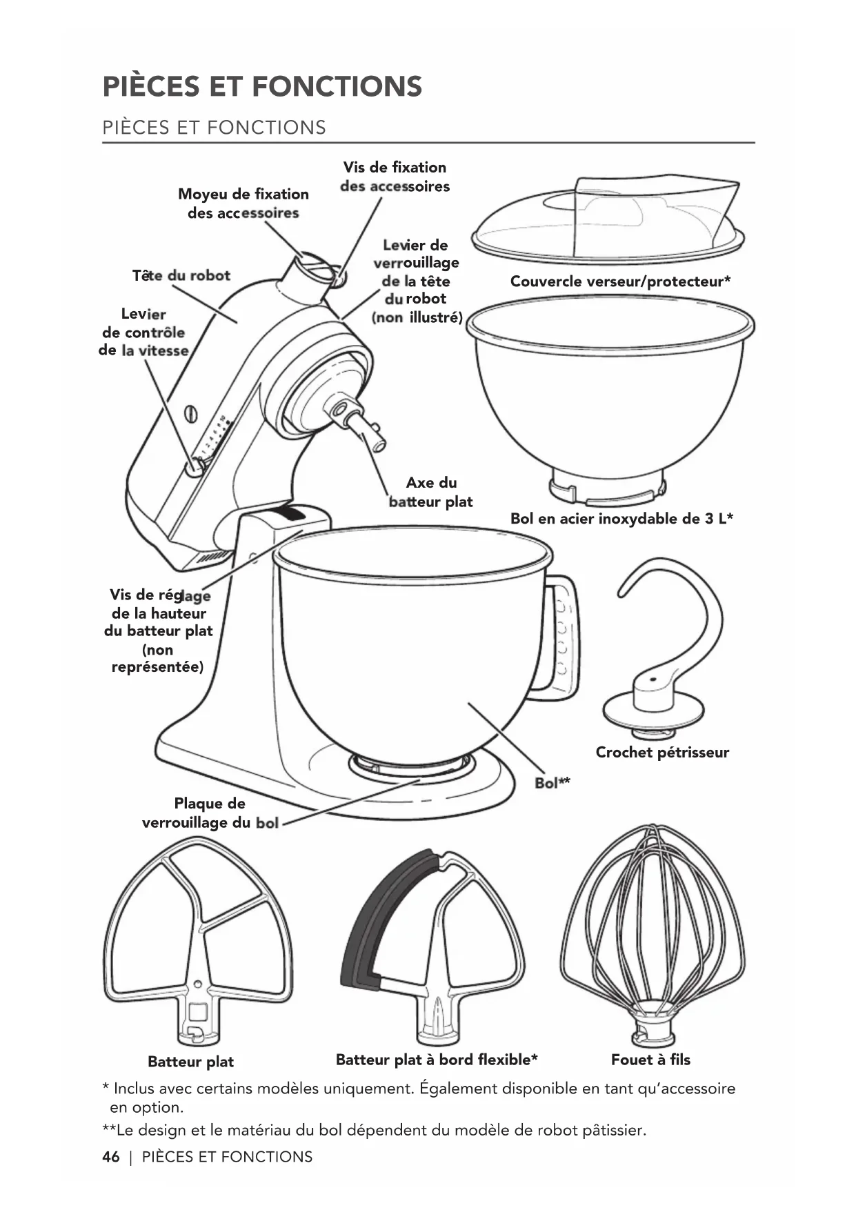 - Inclus avec certains modèles uniquement Également disponible entant qu’accessoire en option **Le design et le matériau du bol dépendent du modèle de robot pâtissier Tête du robot Moyeu de fixation des accessoires Levier de contrôle de la vitesse Vis de réglage de la hauteur du batteur plat (non représentée) Vis de fixation desaccessoires Levier de verrouillage de la tête du robot (nonillustré) Axe du batteur plat Bol** Couvercle verseur/protecteur* Fouet à fils Bol en acier inoxydable de 3 L* Batteur plat Batteur plat à bord flexible* W10863290C_03_FR_v04.indd 46 6/19/17 2:55 PMPRÉCAUTIONS D’EMPLOI DU ROBOT PÂTISSIER | 47FRANÇAIS PRÉCAUTIONS D’EMPLOI DU ROBOT PÂTISSIER Votre sécurité est très importante, au même titre que celle d’autrui. Plusieurs messages de sécurité importants apparaissent dans ce manuel ainsi que sur votre appareil. Lisez-les attentivement et respectez-les systématiquement.Ce symbole est synonyme d’avertissement.Il attire votre attention sur les risques potentiels susceptibles de provoquer des blessures mortelles ou graves à l’utilisateur ou d’autres personnes présentes.Tous les messages de sécurité sont imprimés en regard du symbole d’avertissement ou après les mots « DANGER » ou « AVERTISSEMENT ». Ces mots signient ce qui suit :Vous risquez d’être mortellement ou gravement blessé si vous ne respectez pas immédiatement les instructions.Vous risquez d’être mortellement ou gravement blessé si vous ne respectez pas scrupuleusement les instructions. Tous les messages de sécurité vous indiquent en quoi consiste le danger potentiel, comment réduire le risque de blessures et ce qui peut arriver si vous ne respectez pas les instructions. DANGER AVERTISSEMENT
