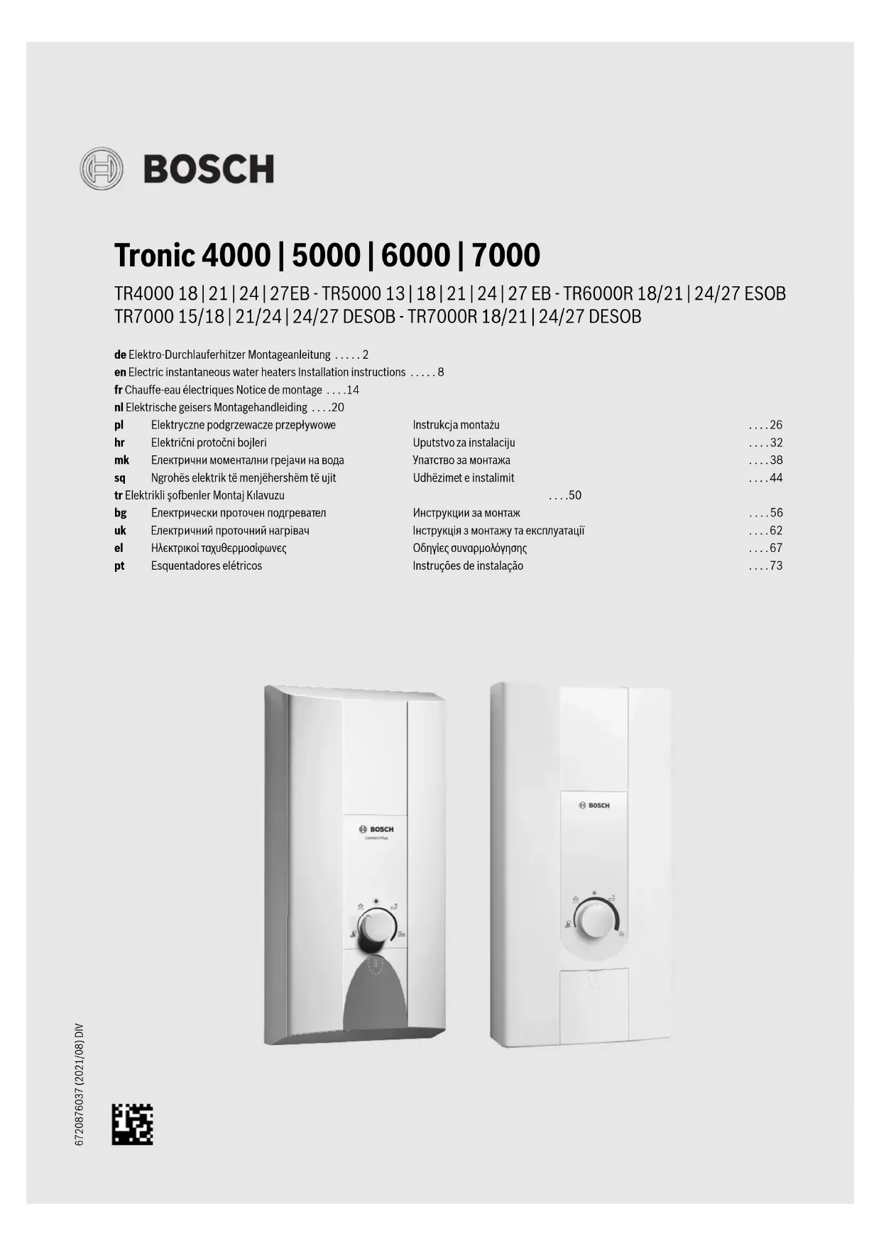 - Uniquement pour appareils appropriés pour le mode solaire : Prémélangeur à thermostat pour le montage dans l’installation domestique lors de l’utilisation de l’eau préchauffée 5 Protection de l’environnement/Recyclage La protection de l’environnement est un principe de base du groupe Bosch. Nous accordons une importance égale à la qualité de nos produits, à leur rentabilité et à la protection de l’environnement. Les lois et prescriptions concernant la protection de l’environnement sont strictement obser- vées. Pour la protection de l’environnement, nous utilisons, tout en respectant les aspects économiques, les meilleurs technologies et matériaux pos- sibles. Emballages En matière d’emballages, nous participons aux systèmes de mise en valeur spécifiques à chaque pays, qui visent à garantir un recyclage opti- mal. Tous les matériaux d’emballage utilisés respectent l’environnement et sont recyclables. Appareils usagés Les appareils usés contiennent des matériaux qui peuvent être réutili- sés. Les composants se détachent facilement. Les matières synthétiques sont marquées. Ceci permet de trier les différents composants en vue de leur recyclage ou de leur élimination. Appareils électriques et électroniques usagés Les appareils électriques et électroniques hors d'usage doivent être collectés séparément et soumis à une élimi- nation écologique (directive européenne sur les appareils usagés électriques et électroniques). Pour l'élimination des appareils électriques et électro- niques usagés, utiliser les systèmes de renvoi et de col- lecte spécifiques au pays. Les batteries ne doivent pas être recyclées avec les ordures ménagères. Les batteries usagées doivent être collectées dans les systèmes de col- lecte locale. 6 Déclaration de protection des données Nous, [FR] elm.leblanc S.A.S., 124-126 rue de Sta- lingrad, 93711 Drancy Cedex, France, [BE] Bosch Thermotechnology n.v./s.a., Zandvoortstraat 47, 2800 Mechelen, Belgique, [LU] Ferroknepper Buderus S.A., Z.I. Um Monkeler, 20, Op den Drieschen, B.P. 201 L-4003 Esch-sur-Alzette, Luxembourg, traitons les informations relatives au produit et à son ins- tallation, l’enregistrement du produit et les données de l’historique du client pour assurer la fonctionnalité du produit (art. 6 (1) phrase 1 (b) du RGPD), pour remplir notre mission de surveillance et de sécurité du pro- duit (art. 6 (1) phrase 1 (f) GDPR), pour protéger nos droits en matière de garantie et d’enregistrement de produit (art. 6 (1) phrase 1 (f) du RGPD), pour analyser la distribution de nos produits et pour fournir des informations et des offres personnalisées en rapport avec le produit (art. 6 (1) phrase 1 (f) du RGPD). Pour fournir des services tels que les ser- vices de vente et de marketing, la gestion des contrats, le traitement des paiements, la programmation, l’hébergement de données et les services d’assistance téléphonique, nous pouvons exploiter les données et les transférer à des prestataires de service externes et/ou à des entreprises affiliées à Bosch. Dans certains cas, mais uniquement si une protection des données appropriée est assurée, les données à caractère personnel peuvent être transférées à des destinataires en dehors de l’Espace éco- nomique européen. De plus amples informations sont disponibles sur demande. Vous pouvez contacter notre responsable de la protection des données à l’adresse suivante : Data Protection Officer, Information Secu- rity and Privacy (C/ISP), Robert Bosch GmbH, Postfach 30 02 20, 70442 Stuttgart, ALLEMAGNE. Vous avez le droit de vous opvposer à tout moment au traitement de vos données à caractère personnel conformément à l’art. 6 (1) phrase 1 (f) du RGPD pour des motifs qui vous sont propres ou dans le cas où vos données personnelles sont utilisées à des fins de marketing direct. Pour exercer votre droit, contactez-nous via l’adresse [FR] pri- vacy.ttfr@bosch.com, [BE] privacy.ttbe@bosch.com, [LU] DPO@bosch.com. Pour de plus amples informations, veuillez scanner le QR code.Inhoudsopgave Tronic 4000 | 5000 | 6000 | 7000 – 6720876037 (2021/08)