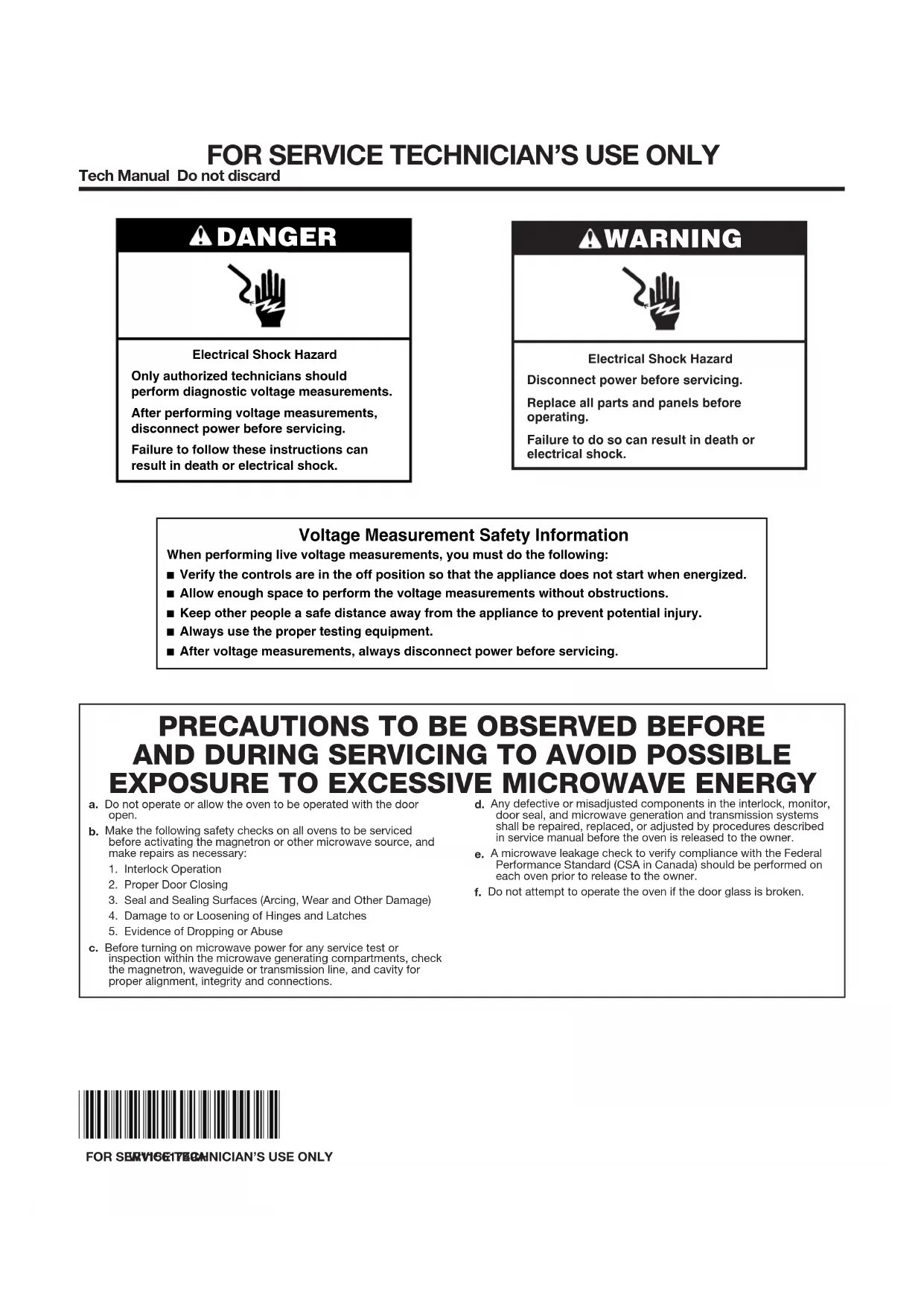 c. Avant d’activer la puissance du four pour tout test de service ou d’inspection dans les compartiments de génération de micro-ondes, vérifier le magnétron, le guide d’ondes ou la ligne de transmission, ainsi que la cavité pour l’alignement, l’intégrité et les connexions correctes. d. Tous les composants défectueux ou mal ajustés dans l’interverrouillage, le contrôle, le joint de la porte et les systèmes de génération de micro-ondes et de transmission doivent être réparés, remplacés ou ajustés en suivant les procédures décrites dans le manuel d’entretien avant de remettre le four au propriétaire. e. Une vérification de fuite de micro-ondes doit être effectuée sur chaque four en conformité avec les normes fédérales (CSA au Canada) avant de le remettre au propriétaire.