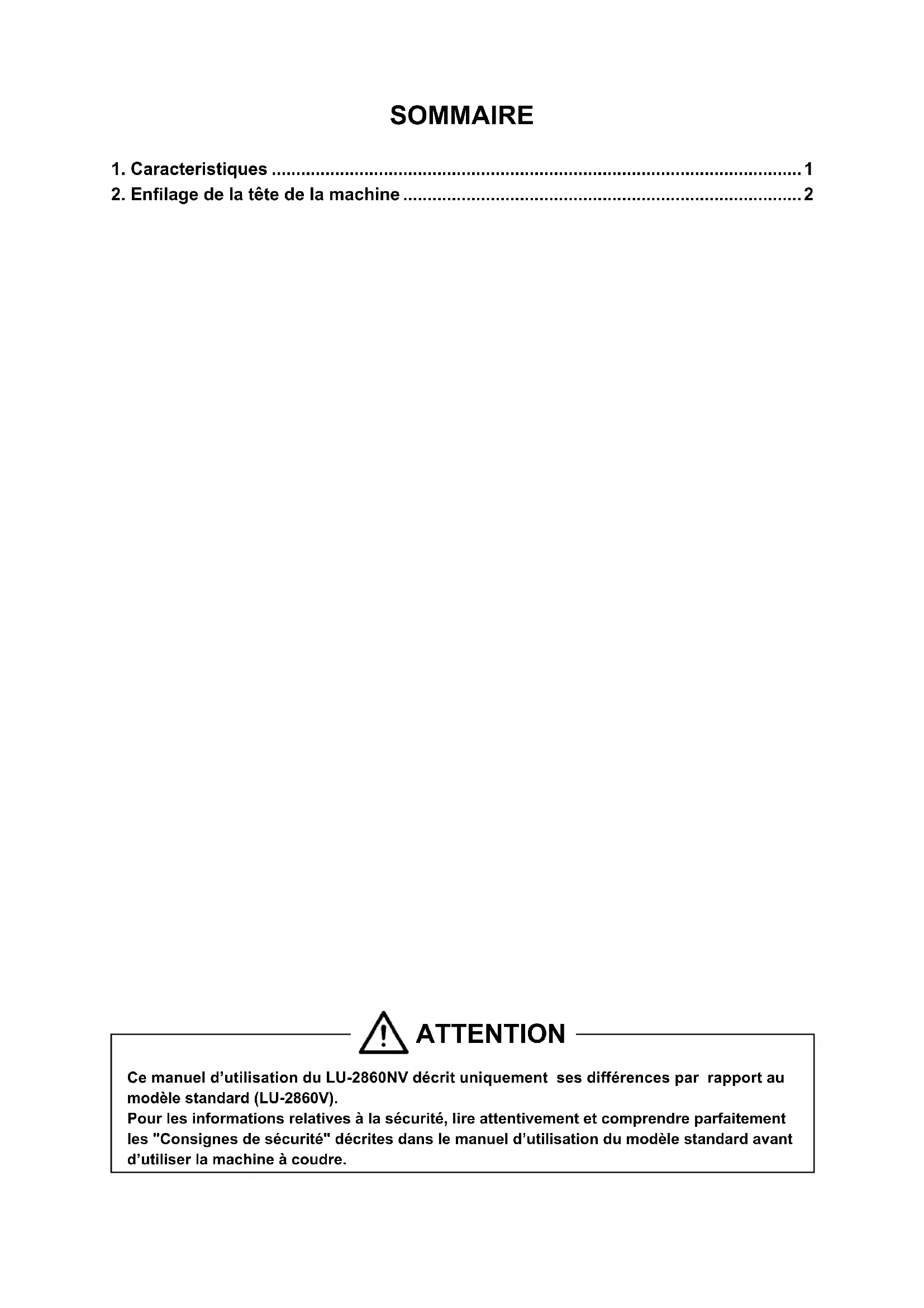 ATTENTION Ce manuel d’utilisation du LU-2860NV décrit uniquement ses différences par rapport au modèle standard (LU-2860V). Pour les informations relatives à la sécurité, lire attentivement et comprendre parfaitement les "Consignes de sécurité" décrites dans le manuel d’utilisation du modèle standard avant d’utiliser la machine à coudre.– 1 –