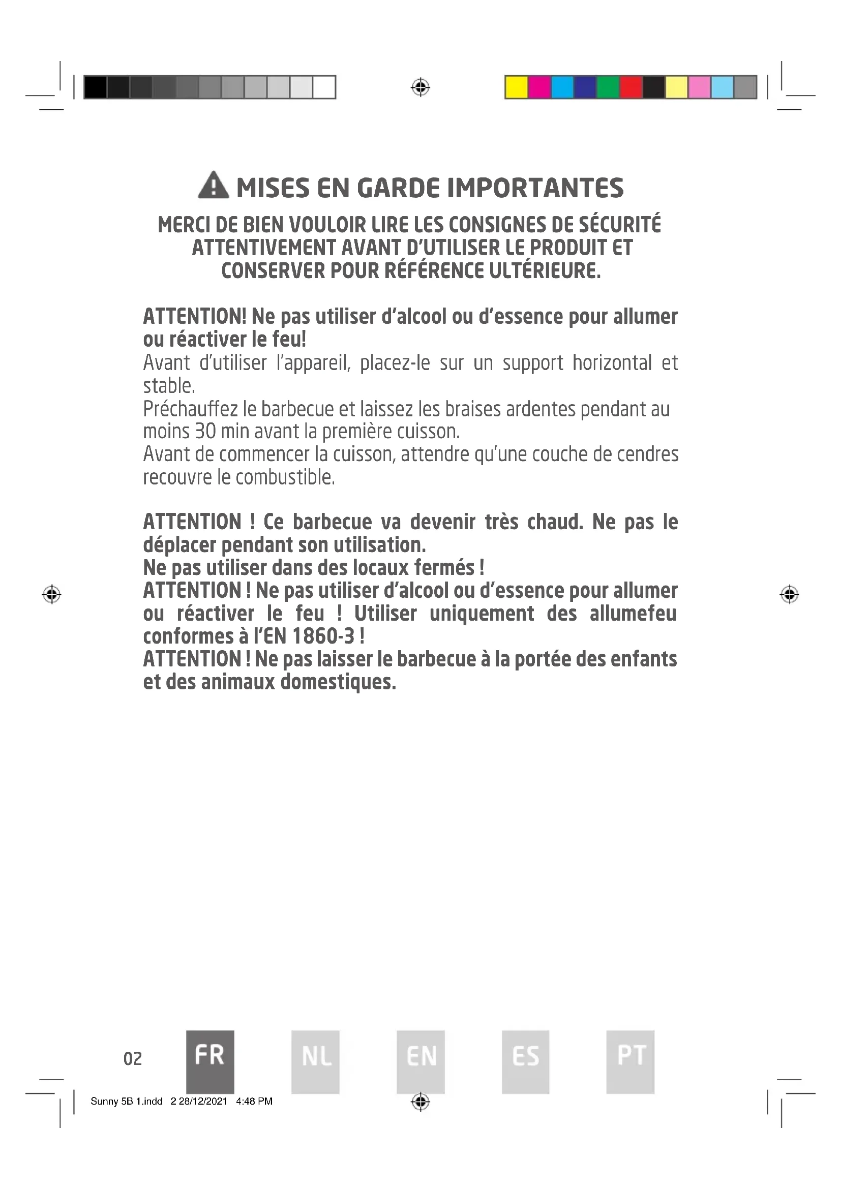 p.10 Sunny 5B 1.indd 1 28/12/2021 4:48 PM02 MERCI DE BIEN VOULOIR LIRE LES CONSIGNES DE SÉCURITÉ ATTENTIVEMENT AVANT D’UTILISER LE PRODUIT ET CONSERVER POUR RÉFÉRENCE ULTÉRIEURE. ATTENTION! Ne pas utiliser d’alcool ou d’essence pour allumer ou réactiver le feu! Avant d’utiliser l’appareil, placez-le sur un support horizontal et stable. Préchauez le barbecue et laissez les braises ardentes pendant au moins 30 min avant la première cuisson. Avant de commencer la cuisson, attendre qu’une couche de cendres recouvre le combustible. ATTENTION ! Ce barbecue va devenir très chaud. Ne pas le déplacer pendant son utilisation. Ne pas utiliser dans des locaux fermés ! ATTENTION ! Ne pas utiliser d’alcool ou d’essence pour allumer ou réactiver le feu ! Utiliser uniquement des allumefeu conformes à l’EN 1860-3 ! ATTENTION ! Ne pas laisser le barbecue à la portée des enfants et des animaux domestiques.