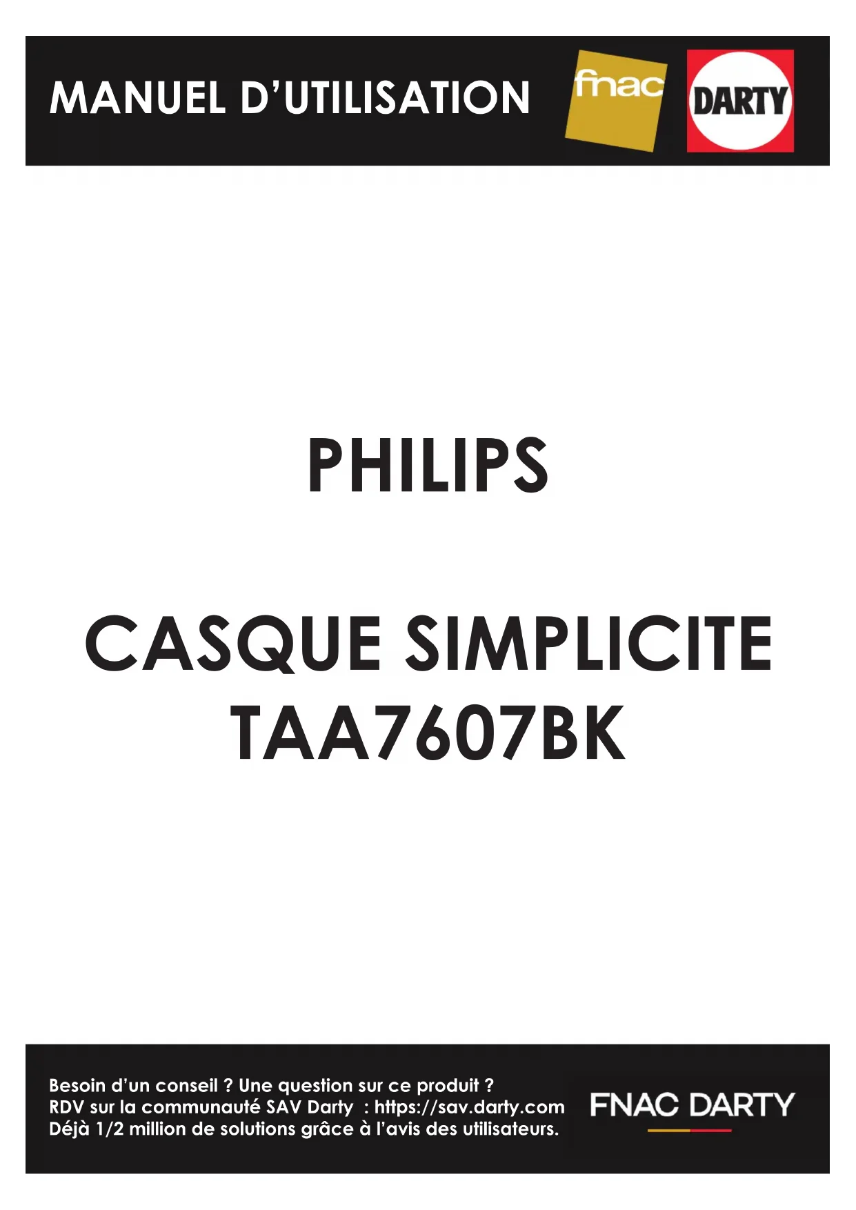 Besoin d’un conseil ? Une question sur ce produit ? RDV sur la communauté SAV Darty : https://sav.darty.com Déjà 1/2 million de solutions grâce à l’avis des utilisateurs. PHILIPS CASQUE SIMPLICITE TAA7607BK MANUEL D’UTILISATIONEnregistrez votre produit pour recevoir une assistance à l’adresse www.philips.com/support Manuel d’utilisation Casque de sport Série7000 TAA76071 Instructions de sécurité importantes 2 Sécurité auditive 2 Informations générales 2 2 Votre casque Bluetooth 3 Contenu de la boîte 3 Autres appareils 3 Aperçu de votre casque Bluetooth sans l 4 3 Mise en route 5 Recharger la batterie 5 Appairage du casque avec votre téléphone portable 5 4 Utilisation de votre casque 6 Connexion du casque à votre appareil Bluetooth 6 Connexion multipoint 6 Gestion de vos appels et de votre musique 6 5 Données techniques 8 6 Avis 9 Déclaration de conformité 9 Mise au rebut de votre ancien produit et de vos piles 9 Retrait de la batterie intégrée 9 Conformité aux CEM 9 Informations environnementales 10 Avis de conformité 10 7 Marques commerciales 11 8 Foire aux questions 12 Tables des matières2 FR 1 Instructions de sécurité importantes Sécurité auditive Danger