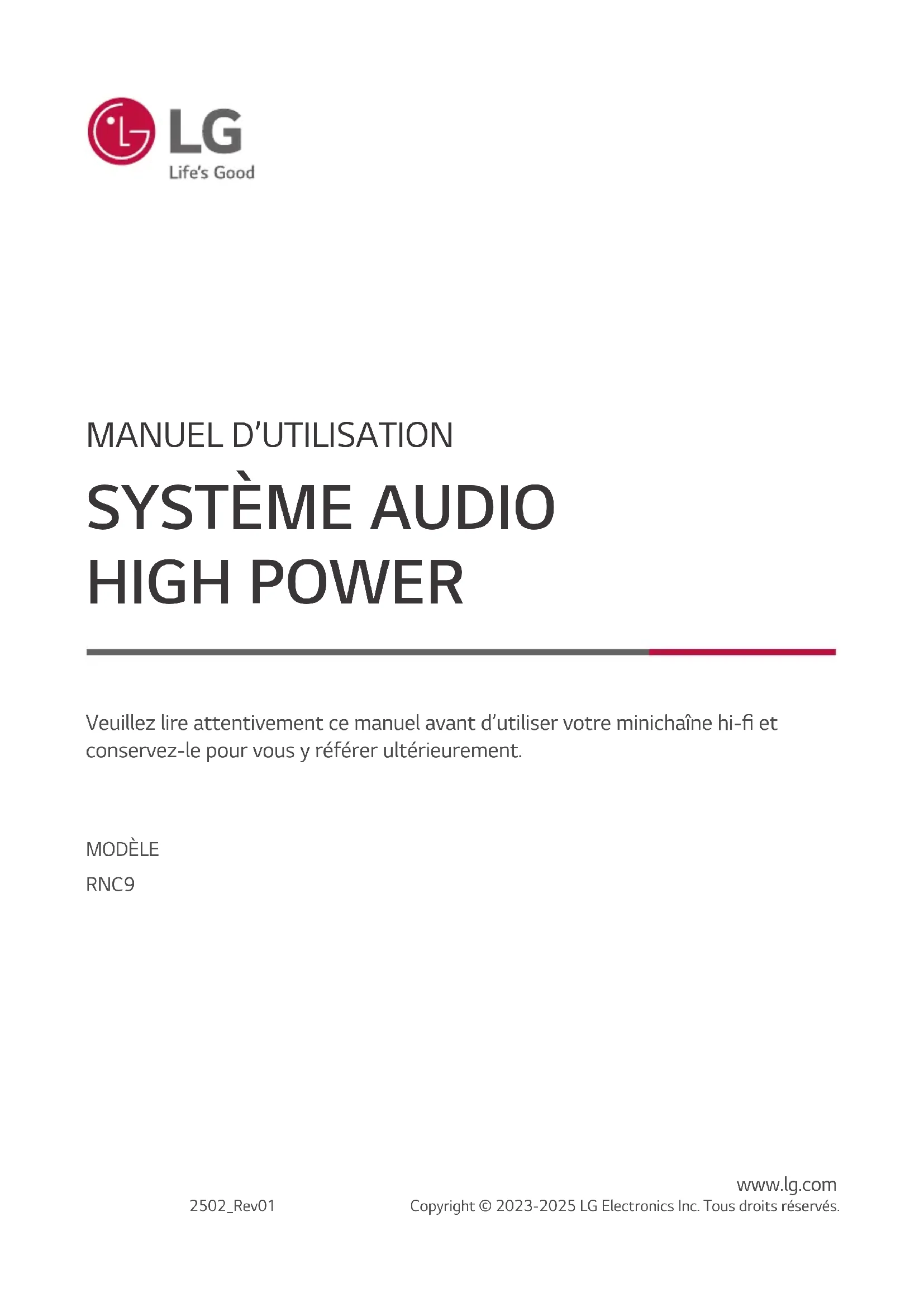 HIGH POWER MODÈLE RNC9 www.lg.com Copyright © 2023-2025 LG Electronics Inc. Tous droits réservés. Veuillez lire attentivement ce manuel avant d’utiliser votre minichaîne hi- et conservez-le pour vous y référer ultérieurement. 2502_Rev011 Démarrage Démarrage2 Démarrage