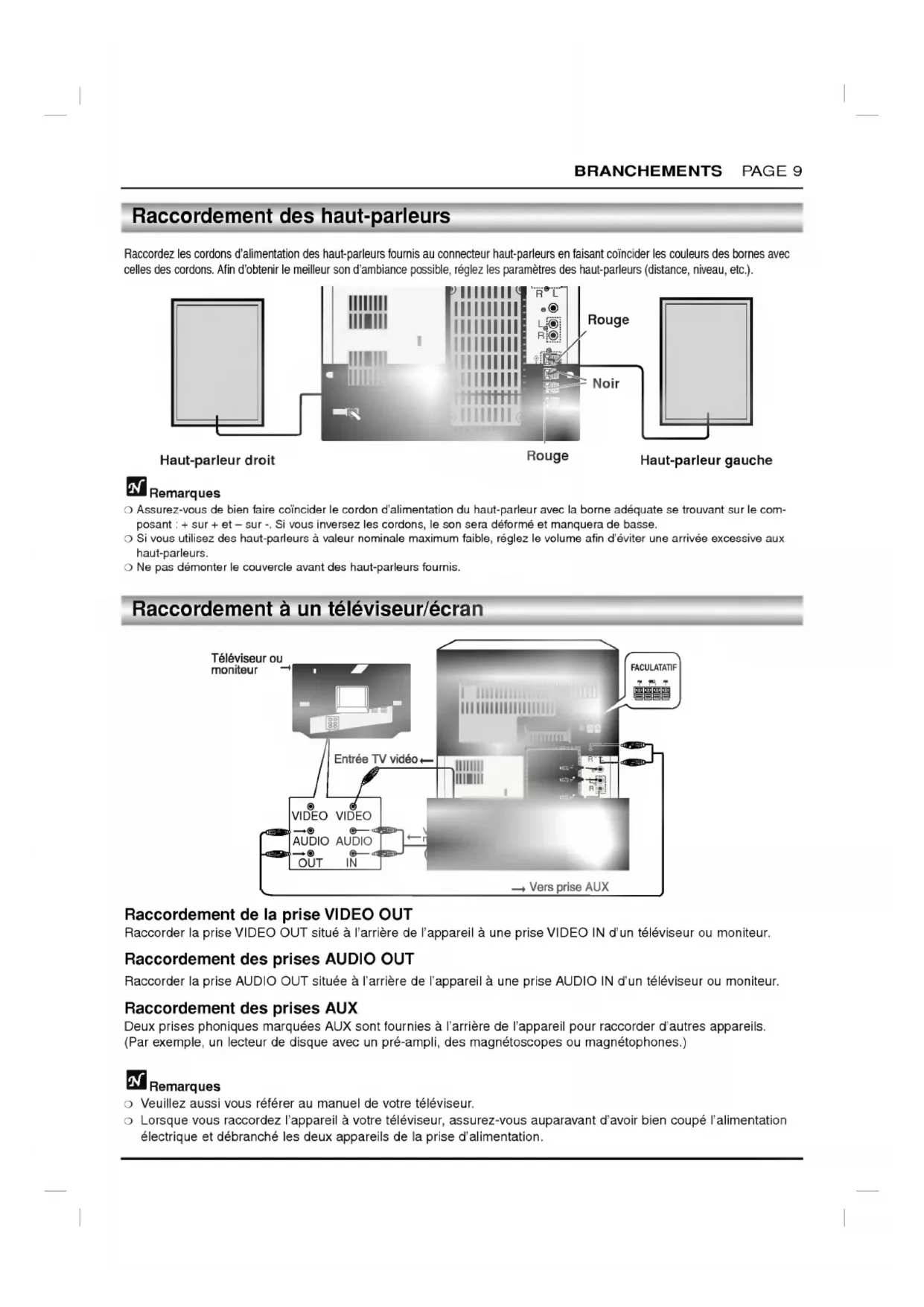 couvercle avant des haut-parleurs fournis. RemarquesVeuillezaussivousrefereraumanueldevotreteleviseur.Lorsquevousraccordezl'appareilavotreteleviseur,assurez-vous auparavant d'avoirbien coupe l'alimentation electrique etdebranchelesdeuxappareilsdelaprised'alimentation.Raccordementdela prise VIDEOOUTRaccorderlapriseVIDEOOUTsitueal'arrieredel'appareilaunepriseVIDEOINd'unteleviseuroumoniteur.Raccordementdes prises AUDIOOUTRaccorderlapriseAUDIOOUTsitueeal'arrieredel'appareilaunepriseAUDIOINd'unteleviseuroumoniteur.Raccordementdes prises AUXDeuxprisesphoniques marquees AUXsontfourniesal'arrieredel'appareilpourraccorderd'autresappareils.(Parexemple,unlecteurdedisqueavecun pre-ampli, des magnetoscopes magnetophones.) Raccordement