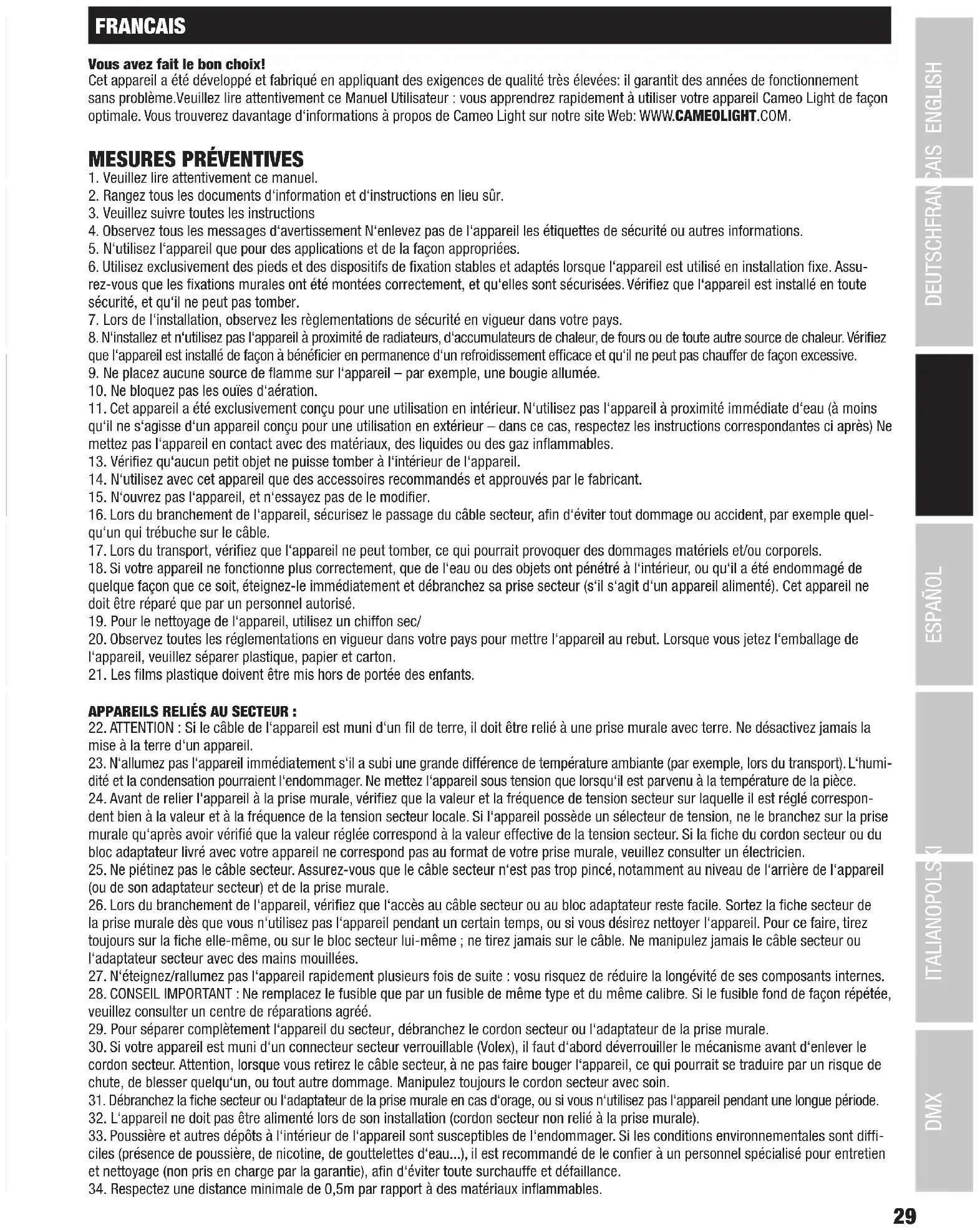 Nos conditions actuelles de garantie et de limitation de responsabilité sont disponibles à l‘adresse suivante : https://cdn-shop.adamhall.com/ media/pdf/MANUFACTURERS-DECLARATIONS_CAMEO.pdf. Pour les réparations, veuillez contacter Adam Hall GmbH, Adam-Hall-Str. 1, 61267 Neu Anspach / E-Mail Info@adamhall.com / +49 (0)6081 / 9419-0. TRI ET MISE AUX DÉCHETS CORRECTE DE CE PRODUIT (Valid in the European Union and other European countries with waste separation) (Applicable dans l‘Union Européenne et les autres pays européens pratiquant le tri des déchets) La présence de ce symbole sur le produit ou sur la documentation correspondante indique qu‘en fin de vie, le produit ne doit pas être jeté avec les déchets normaux, afin d‘éviter tout dommage à l‘environnement ou aux personnes consécutive à une élimination non contrôlée des déchets. Séparez-le des aut- res types de déchets et recyclez-le, afin de promouvoir la réutilisation durable des ressources naturelles. Nous conseillons aux utilisateurs non professionnels de contacter le revendeur chez qui ils ont acheté le produit, ou un représentant gouvernemental local, pour plus de42 DMX ITALIANO POLSKI ESPAÑOL FRANCAIS DEUTSCHENGLISH Conformité CE La société Adam Hall GmbH déclare par la présente que ce produit est compatible avec les régulations suivantes (le cas échéant) : R&TTE (1999/5/EG) et RED (2014/53/EU) à partir de juin 2017 Directive basse tension (2014/35/EU) Directive CEM (2014/30/EU) RoHS (2011/65/EU) La Déclaration de Conformité complète est disponible sur le site Web www.adamhall.com. Pour toute information complémentaire, contactez-nous : info@adamhall.com. détails sur le lieu de collecte et la façon de recycler cet appareil dans le meilleur respect de l‘environnement possible.. Nous invitons les utilisateurs professionnels à contacter leur fournisseur et à vérifier les termes et conditions de leur contrat d‘achat. Ce produit ne doit pas être mélangé à d‘autres déchets commerciaux lors de la collecte.43 DMX DEUTSCHFRANCAIS ESPAÑOL ENGLISH ITALIANO POLSKI ESPAÑOL ¡GRACIAS POR ELEGIR CAMEO LIGHT! Este equipo está diseñado y fabricado con los estándares de calidad más exigentes, para garantizar un correcto funcionamiento durante muchos años.Lea atentamente este manual de usuario para poder aprovechar rápidamente toda la funcionalidad de su nuevo producto de Cameo Light. Más información sobre Cameo Light en la web WWW.CAMEOLIGHT.COM.