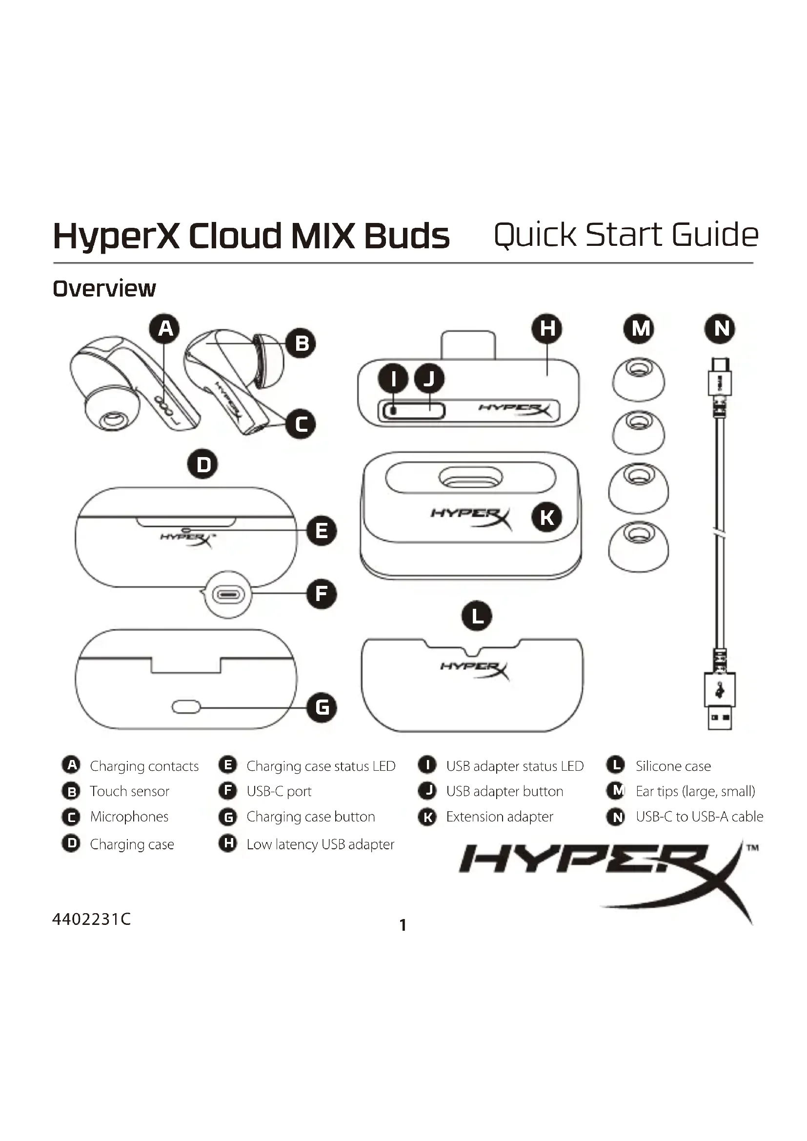 l'adaptateur USB clignote en blanc. Lorsqu'il n'est pas utilisé avec un appareil mobile, il est recommandé d'utiliser l'adaptateur d'extension inclus et les câbles USB-C vers USB-A. 2. Lorsque les écouteurs sont allumés, ils se connectent automatiquement à l'adaptateur USB et le voyant LED de l'adaptateur USB s’illumine en blanc. Les Cloud MIX Buds se connectent en priorité à l’adaptateur USB et passent automatiquement du Bluetooth® à la connexion à faible latence lorsque cette dernière devient disponible. Pour basculer manuellement la connexion entre l’adaptateur à faible latence et le dispositif Bluetooth®, appuyer longuement sur le bouton de l’adaptateur USB. Utilisation des commandes tactiles Les commandes multimédia suivantes peuvent être utilisées en Bluetooth® ou avec l'adaptateur USB à faible latence : Les commandes de téléphone suivantes sont disponibles lors de l'utilisation du Bluetooth®: Remarque : Le contrôle tactile peut varier selon les appareils et les applicationsDésactivation des micros lors de l’utilisation de l’adaptateur USB à faible latence Appuyer sur le bouton de l’adaptateur USB pour désactiver/activer le micro de l’adaptateur USB à faible latence. Le voyant LED de l’adaptateur USB s’illumine en rouge lorsque le microphone est désactivé.Vérication du niveau de batterie du boîtier de charge Appuyez sur le bouton du boîtier de charge pour vérier son niveau de la batterie, indiqué par un clignotement et une illumination xe du voyant LED.Charge Il est recommandé de charger complètement le boîtier de charge et les écouteurs avant la première utilisation. Durante la ricarica, il LED di stato della custodia di ricarica indicherà il livello di carica degli auricolari. Lorsque le boîtier de charge est vide, son voyant LED indique son niveau de batterie. Mode Bluetooth A2DP : Jusqu’à 33 heures / Mode de latence ultra-basse : Jusqu’à 21 heures *Testé à 50 % du volume du casque, en lecture continue. En mode A2DP, les écouteurs ont une autonomie de 10 heures et jusqu’à 23 heures supplémentaires grâce au boîtier de charge. Avec le mode de latence ultra-basse, les écouteurs ont une autonomie de 6 heures et jusqu’à 15 heures supplémentaires avec le boîtier de charge. L’autonomie réelle de la batterie varie en fonction de l’utilisation. La capacité maximale diminue naturellement avec le temps et l’utilisation.HyperX NGENUITY Mobile Pour personnaliser le son, les commandes et d'autres paramètres, veuillez télécharger l'application HyperX NGENUITY Mobile sur l’App Store d’iOS ou le Google Play d’Android.Des questions ou des problèmes de conguration ?Contactez l'équipe d'assistance HyperX ou consultez le manuel d'utilisation sur : hyperxgaming.com/support/headsets ATTENTION : L'exposition prolongée à des niveaux sonores élevés peut provoquer une détérioration irréversible de la capacité auditive.ITALIANODescrizione generale del prodottoA - Contatti di ricaricaB - Sensore tattileC - MicrofoniD - Custodia di ricaricaAccensione e spegnimento degli auricolari Per accendere gli auricolari, aprire la custodia di ricarica. Il LED di stato della custodia di ricarica indicherà il livello di carica degli auricolari. Per spegnere gli auricolari, riposizionarli nella base di ricarica e chiudere il coperchio. Il LED della custodia si spegnerà. Connessione degli auricolari1. Aprire il coperchio della custodia di ricarica lasciando gli auricolari all'interno.2. Tenere premuto il pulsante della base di ricarica per 3 secondi. Il LED di stato della custodia di ricarica inizierà emettere un lampeggio di colore blu.3. Sul dispositivo compatibile con Bluetooth® individuare HyperX Cloud MIX Buds e avviare la connessione. Una volta stabilita la connessione, il LED di stato della custodia di ricarica mostrerà una luce ssa di colore blu, che successiva- mente si spegnerà tornando a indicare il livello di carica della batteria.Connessione dell'adattatore USB a bassa latenza