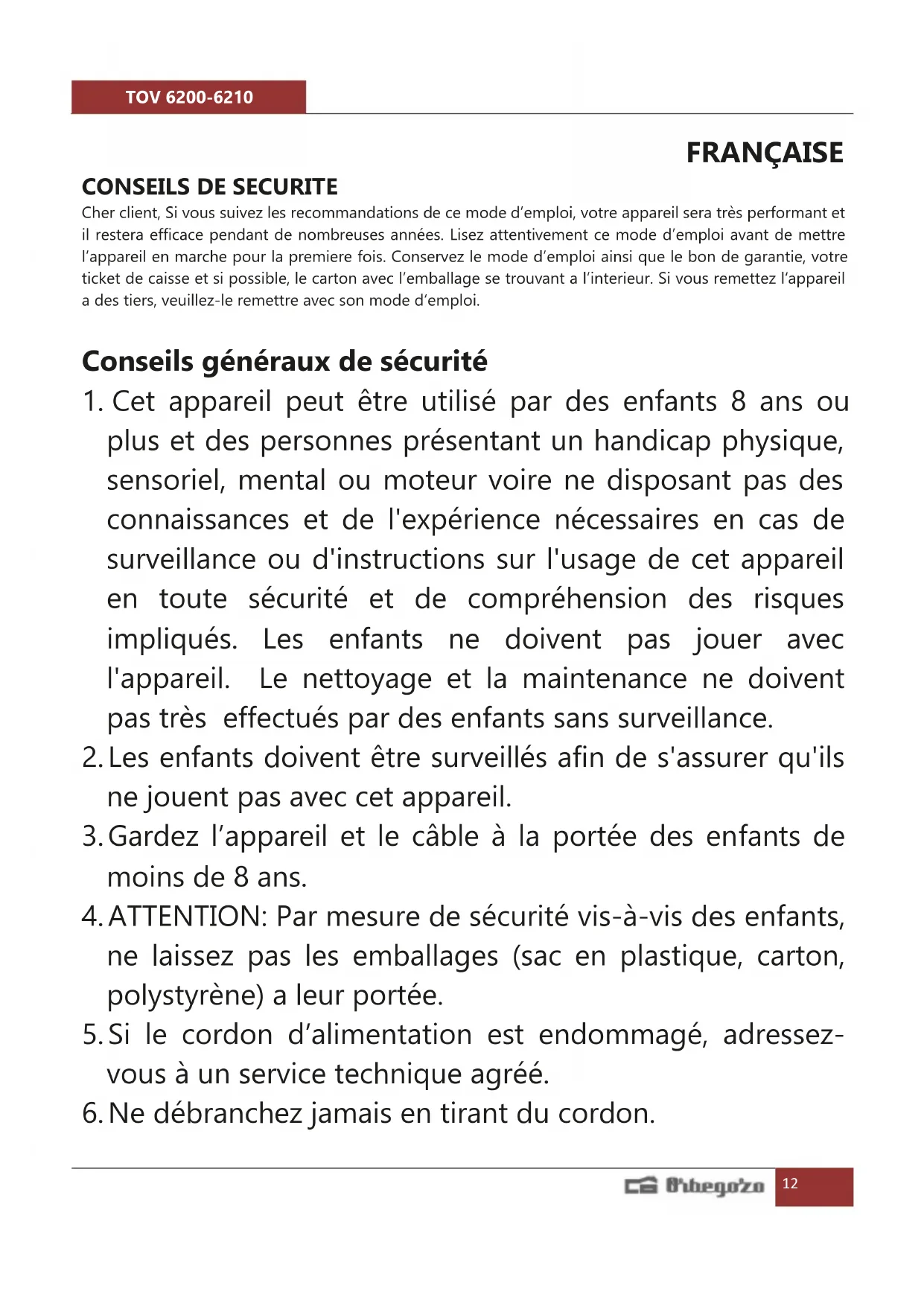 MODE D'EMPLOI TOV 6200 Orbegozo