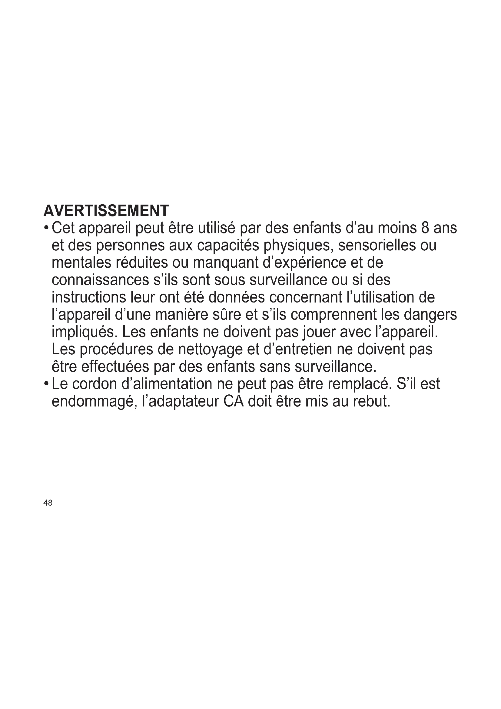 Cet appareil peut être utilisé par des enfants d’au moins 8 ans et des personnes aux capacités physiques, sensorielles ou mentales réduites ou manquant d’expérience et de connaissances s’ils sont sous surveillance ou si des instructions leur ont été données concernant l’utilisation de l’appareil d’une manière sûre et s’ils comprennent les dangers impliqués. Les enfants ne doivent pas jouer avec l’appareil. Les procédures de nettoyage et d’entretien ne doivent pas être effectuées par des enfants sans surveillance.