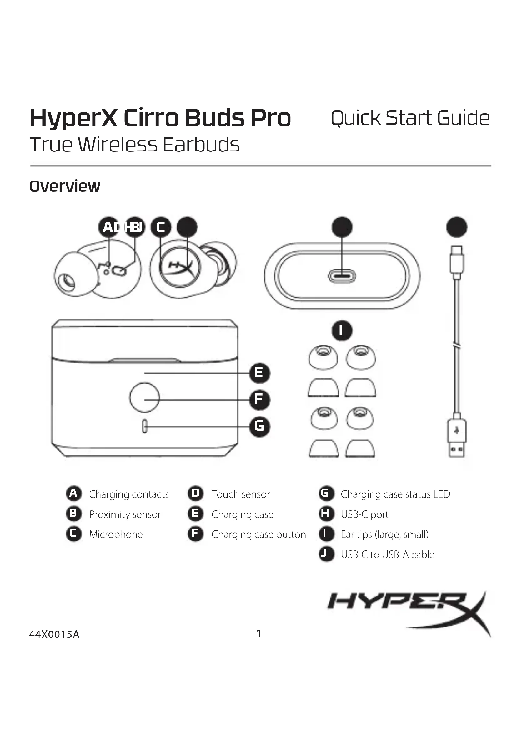 Wireless Earbuds/無線耳機/无线耳机, Model/型號/型号: CEB005 ©Copyright 2022 HyperX and the HyperX logo are registered trademarks or trademarks of HP Inc. in the U.S. and/or other countries. All registered trademarks and trademarks are property of their respective owners. / HyperX et le logo HyperX sont des marques déposées ou des marques commerciales de HP Inc. aux États-Unis et/ou dans d'autres pays. Toutes les marques déposées et les marques commerciales sont la propriété de leurs détenteurs respectifs. / HP Inc. 1501 Page Mill Road, Palo Alto, CA 94304, USA. HP, HQ-TRE, 71025 Boeblingen, Germany. HP Inc UK Ltd, Regulatory Enquiries, Earley West, 300 Thames Valley Park Drive, Reading, RG6 1PT. Қазақстан: “ЭйчПи Глобал Трэйдинг Би.Ви.” компаниясыныц Қазақстандағы филиалы, Қазақстан Республикасы, 050040, Алматы к., Бостандык ауданы, Әл-Фараби даңғ ылы, 77/7 Телефон/факс: +7 727 356 21 80. HP Inc. 1501 Page Mill Road, Пало -Альто, Каліфорнія 94304, США. 台灣惠普資訊科技股份有限公司 台北市南港 區經貿二路 66 號 10 樓 電話: 886237899900FRANÇAIS Présentation A - Contacts de charge B - Capteur de proximité C - Microphone Charge Il est recommandé de charger complètement les écouteurs et le boîtier de charge avant leur première utilisation. Pour charger les écouteurs, les placer dans le boîtier de charge et fermer le couvercle. Si le boîtier de charge n’est pas connecté à une source d’alimentation, son voyant LED indique le ou les écouteurs en cours de charge. Pour charger le boîtier de charge, connecter une source d’alimentation au port USB-C situé au bas de ce dernier. Le voyant LED du boîtier de charge s’allume pour indiquer le niveau actuel de la batterie. Le voyant LED clignote pour indiquer le statut de charge jusqu’à devenir xe, ce qui indique une charge complète. Une fois entièrement chargé, si vous ouvrez le couvercle du boîtier ou si vous appuyez sur le bouton, le voyant LED s’éteint. Allumer et éteindre les écouteurs Pour allumer les écouteurs, ouvrir le boîtier de charge. Les écouteurs s’allument et le voyant LED du boîtier de charge clignote pour indiquer le niveau de sa batterie. Les écouteurs peuvent être allumés en dehors du boîtier en touchant les capteurs tactiles pendant 3 secondes. Pour éteindre les écouteurs, les remettre dans le boîtier de charge et fermer le couvercle. Les écouteurs s’éteignent et le voyant LED du boîtier de charge indique le ou les écouteurs en cours de charge. Les écouteurs peuvent aussi être éteints en dehors du boîtier en touchant les capteurs tactiles pendant 8 secondes. Couplage des écouteurs