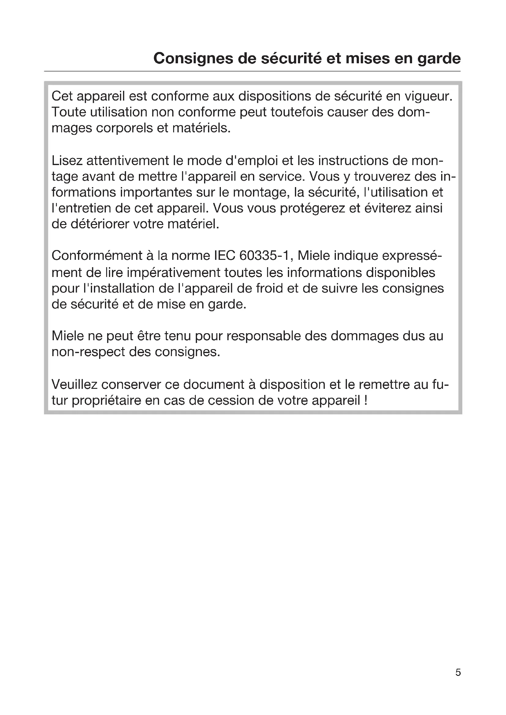 Cet appareil est conforme aux dispositions de sécurité en vigueur. Toute utilisation non conforme peut toutefois causer des dom- mages corporels et matériels. Lisez attentivement le mode d'emploi et les instructions de mon- tage avant de mettre l'appareil en service. Vous y trouverez des in- formations importantes sur le montage, la sécurité, l'utilisation et l'entretien de cet appareil. Vous vous protégerez et éviterez ainsi de détériorer votre matériel. Conformément à la norme IEC60335-1, Miele indique expressé- ment de lire impérativement toutes les informations disponibles pour l'installation de l'appareil de froid et de suivre les consignes de sécurité et de mise en garde. Miele ne peut être tenu pour responsable des dommages dus au non-respect des consignes. Veuillez conserver ce document à disposition et le remettre au fu- tur propriétaire en cas de cession de votre appareil!Consignes de sécurité et mises en garde