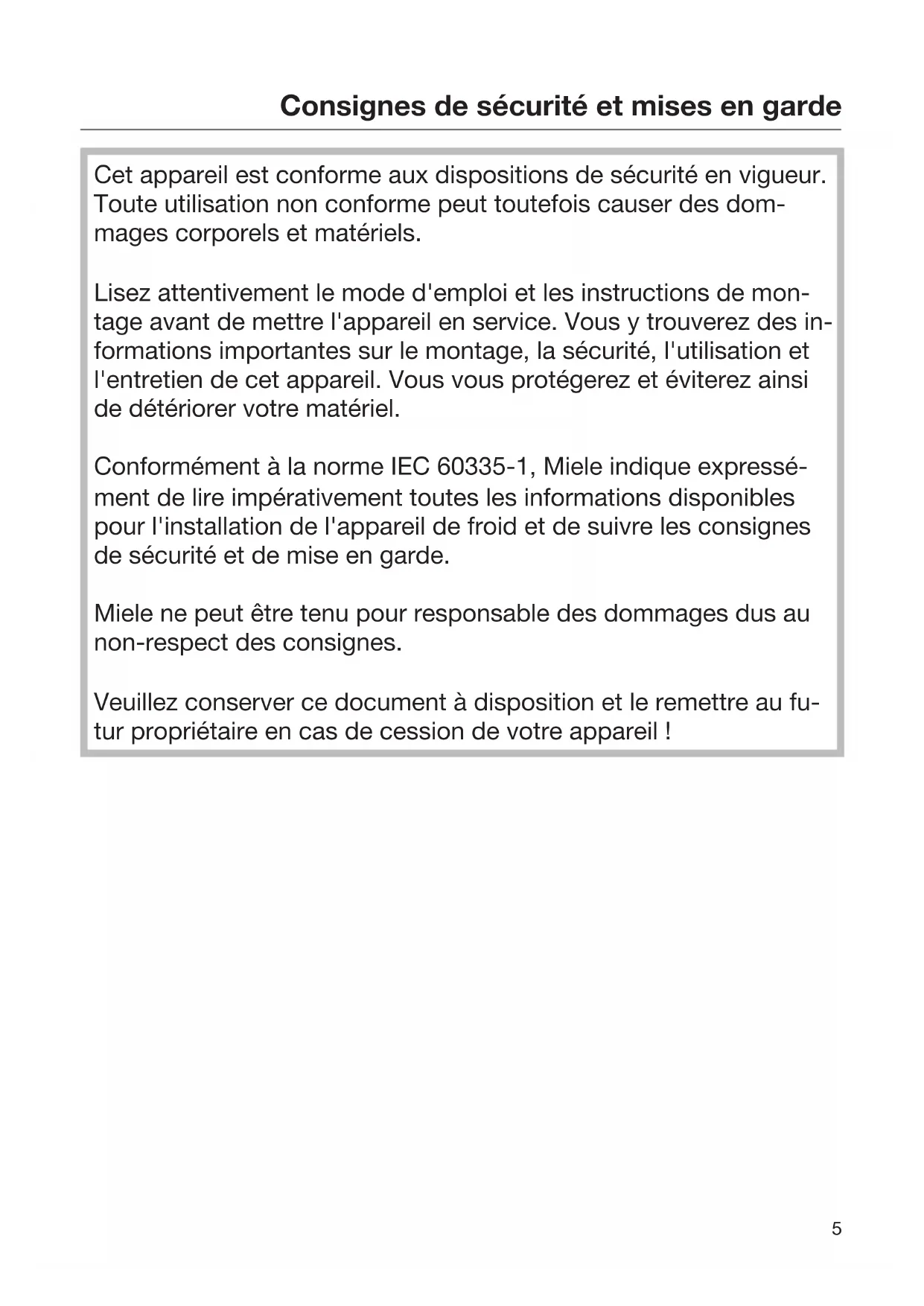 Cet appareil est conforme aux dispositions de sécurité en vigueur. Toute utilisation non conforme peut toutefois causer des dom- mages corporels et matériels. Lisez attentivement le mode d'emploi et les instructions de mon- tage avant de mettre l'appareil en service. Vous y trouverez des in- formations importantes sur le montage, la sécurité, l'utilisation et l'entretien de cet appareil. Vous vous protégerez et éviterez ainsi de détériorer votre matériel. Conformément à la norme IEC60335-1, Miele indique expressé- ment de lire impérativement toutes les informations disponibles pour l'installation de l'appareil de froid et de suivre les consignes de sécurité et de mise en garde. Miele ne peut être tenu pour responsable des dommages dus au non-respect des consignes. Veuillez conserver ce document à disposition et le remettre au fu- tur propriétaire en cas de cession de votre appareil!Consignes de sécurité et mises en garde
