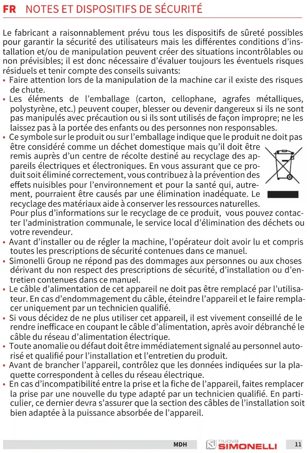 - En cas d’incompatibilité entre la prise et la fiche de l’appareil, faites remplacer la prise par une nouvelle du type adapté par un technicien qualifié. En parti- culier, ce dernier devra s’assurer que la section des câbles de l’installation soit bien adaptée à la puissance absorbée de l’appareil. FR NOTES ET DISPOSITIFS DE SÉCURITÉ12 MDH