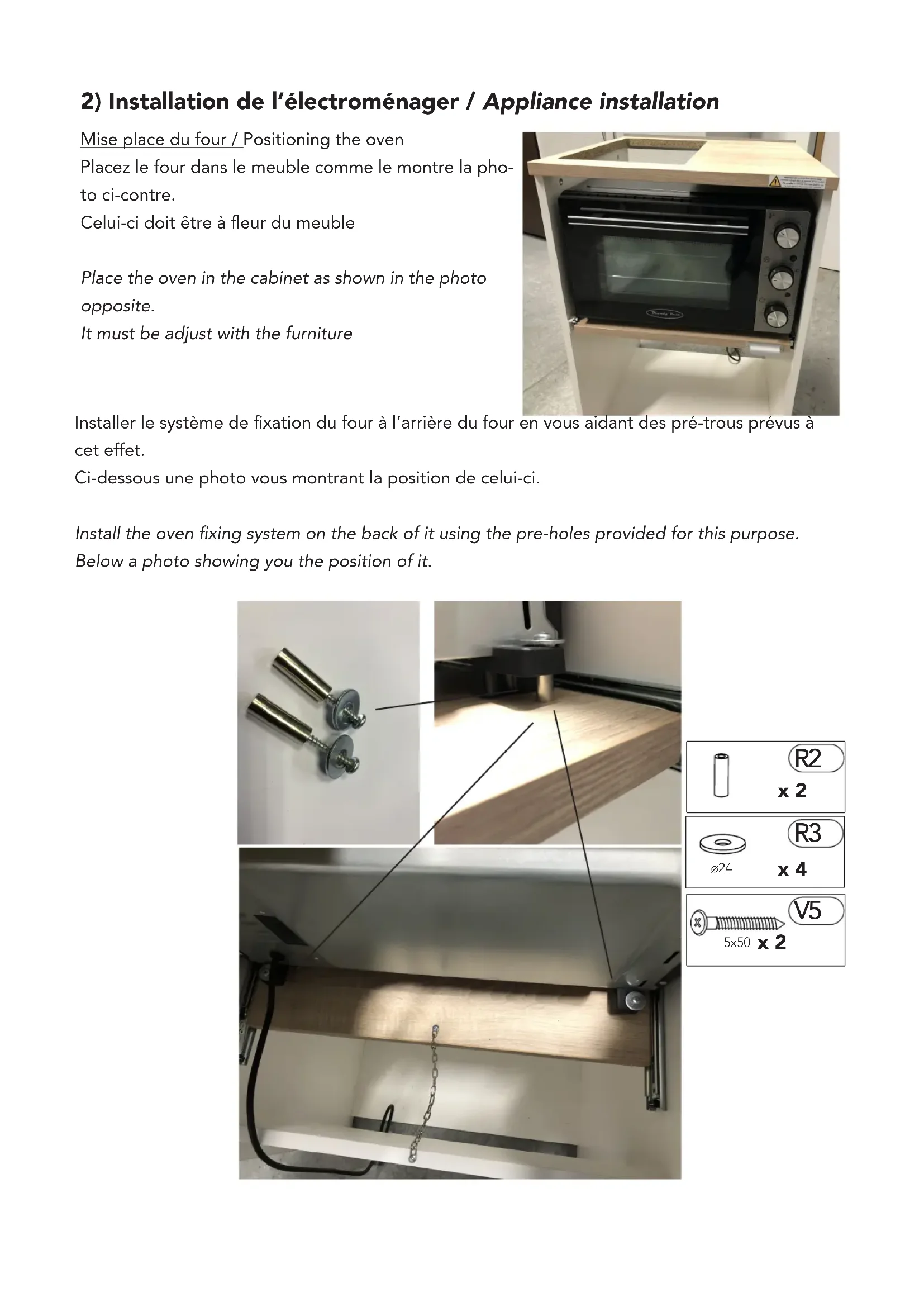 x 1Plan de travail /Work table Mur / Wall Crédence du meuble /Furniture credenza Meuble / Furniture Fixation murale anti-basculement (vis non four- nies) Wall fixing anti-tilt (screws not supplied) ATTENTION : Pour des raisons de sécurité, le meuble doit être fixé au mur à l’aide de la fixation murale fournit avec ce kit. CAUTION: For safety reasons, the cabinet must be fixed to the wall using the wall bracket supplied with this kit. Pour installer la fixation, placez votre meuble contre le mur, placez le support de fixation au centre du meuble à environ 1mm en dessous de la crédence en veillant bien à ce sa position soit la plus proche du schéma d’installation ci-contre. Marquez les trous de perçage, retirez votre meuble, fixez le support. Une fois que vos appareils électroména- gers sont en places et connectés, rappro- chez votre meuble de son emplacement en le faisant rentrer la crédence dans la rainure du support de fixation. To install the fixing, place your furniture against the wall, place the fixing support in the center of the furniture about 1mm below the credenza, making sure that its position is closest to the installation diagram opposite. Mark the drilling holes, remove your furniture, fix the sup- port. Once your household appliances are in place and connec- ted, bring your furniture closer to its location by making it fit the splashback in the groove of the fixing bracket.2) Installation de l’électroménager / Appliance installation Installer le système de fixation du four à l’arrière du four en vous aidant des pré-trous prévus à cet effet. Ci-dessous une photo vous montrant la position de celui-ci. Install the oven fixing system on the back of it using the pre-holes provided for this purpose. Below a photo showing you the position of it. Mise place du four / Positioning the oven Placez le four dans le meuble comme le montre la pho- to ci-contre. Celui-ci doit être à fleur du meuble Place the oven in the cabinet as shown in the photo opposite. It must be adjust with the furniture